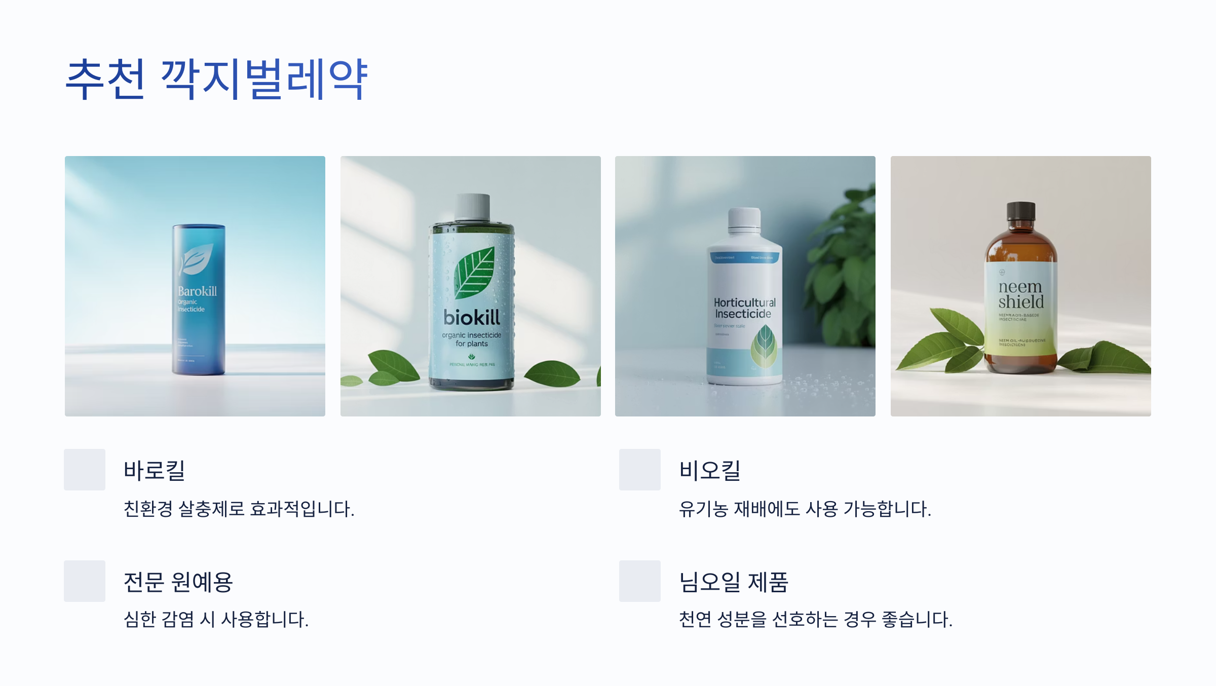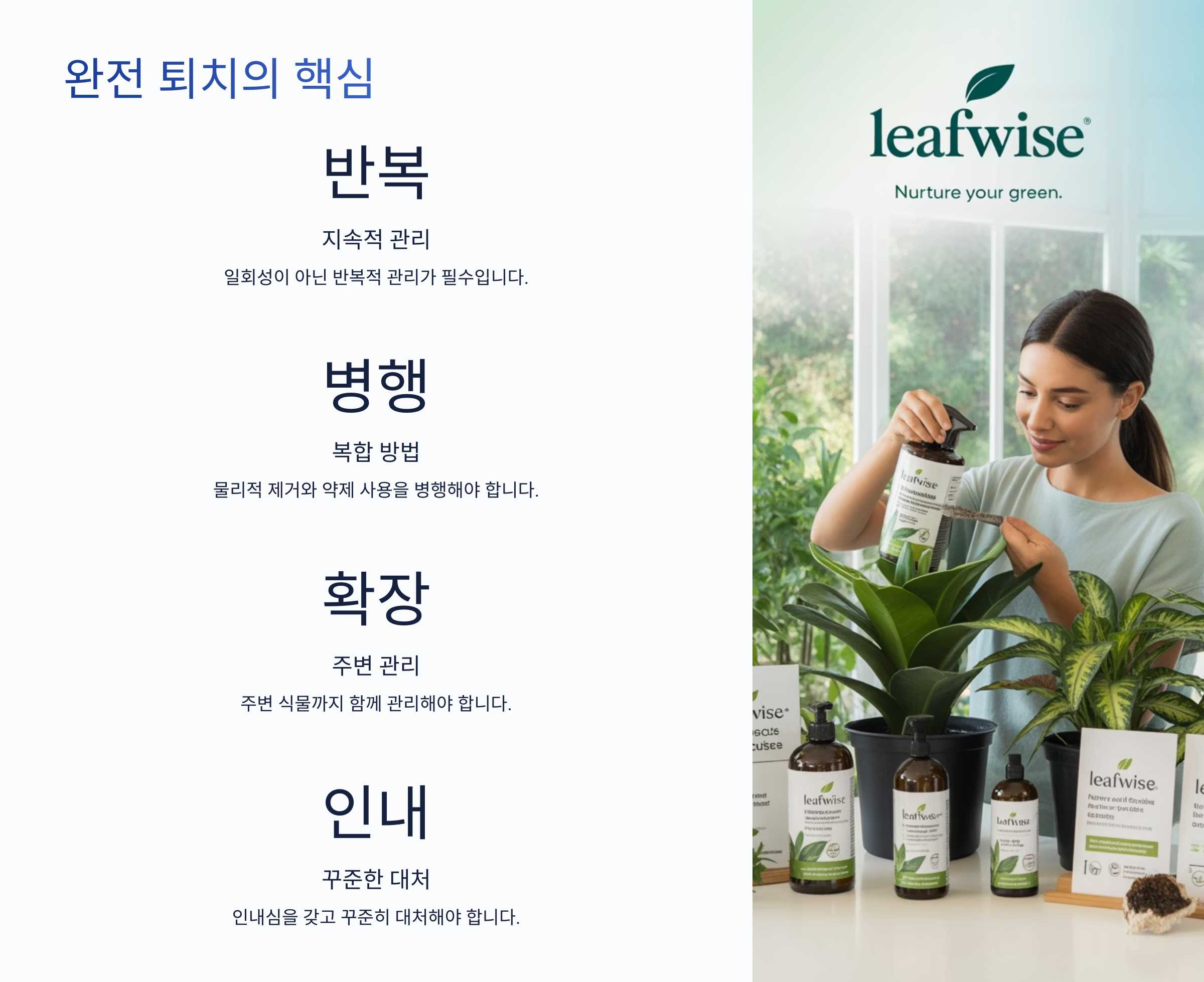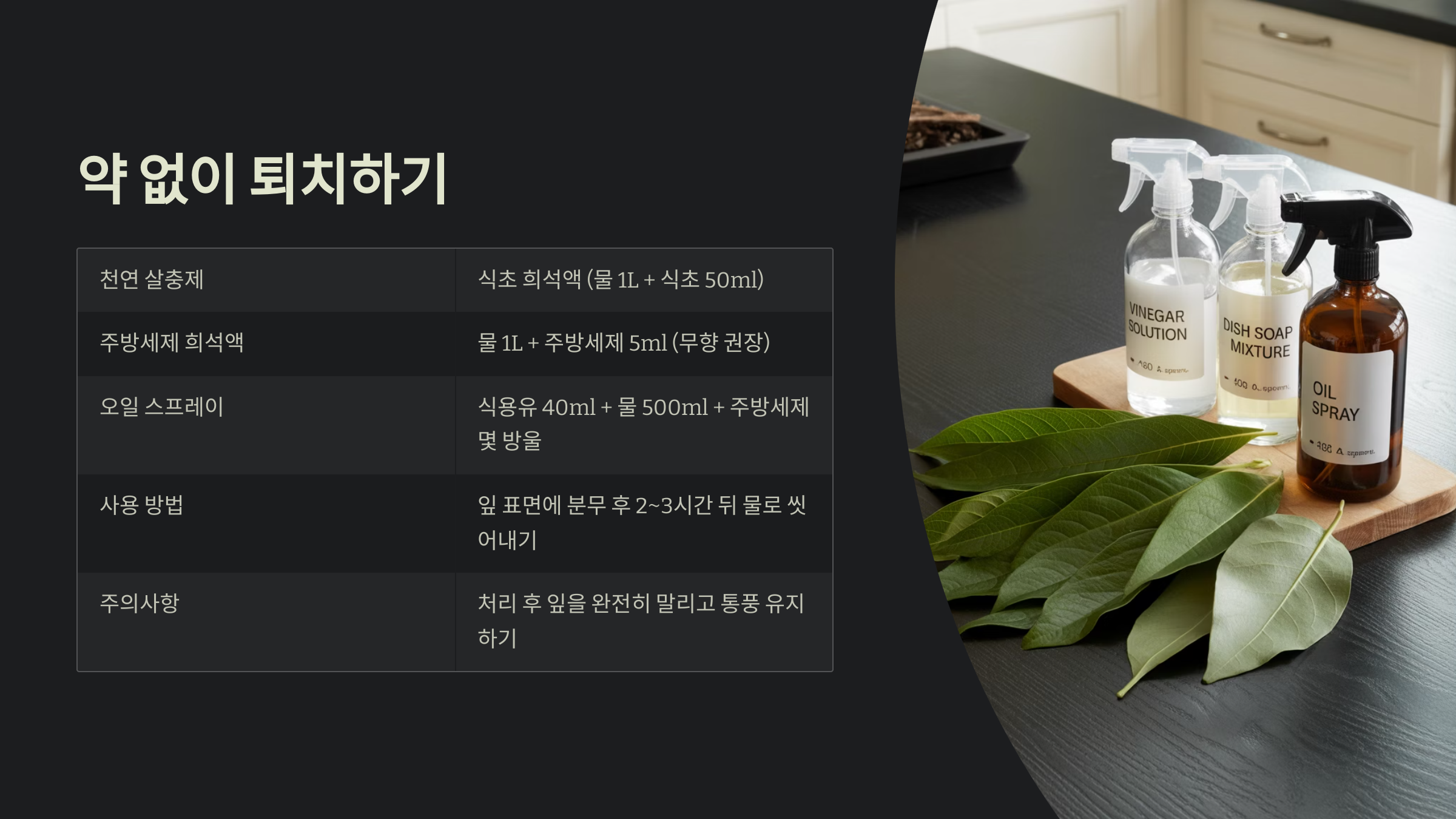 친환경 방제 시 주의사항: 반드시 해가 진 저녁이나 흐린 날 오전에 사용하고, 사용 전 식물의 작은 부분에 테스트하여 약해가 없는지 확인하세요. 3~5일 간격으로 2~3회 반복해야 효과를 높일 수 있습니다.