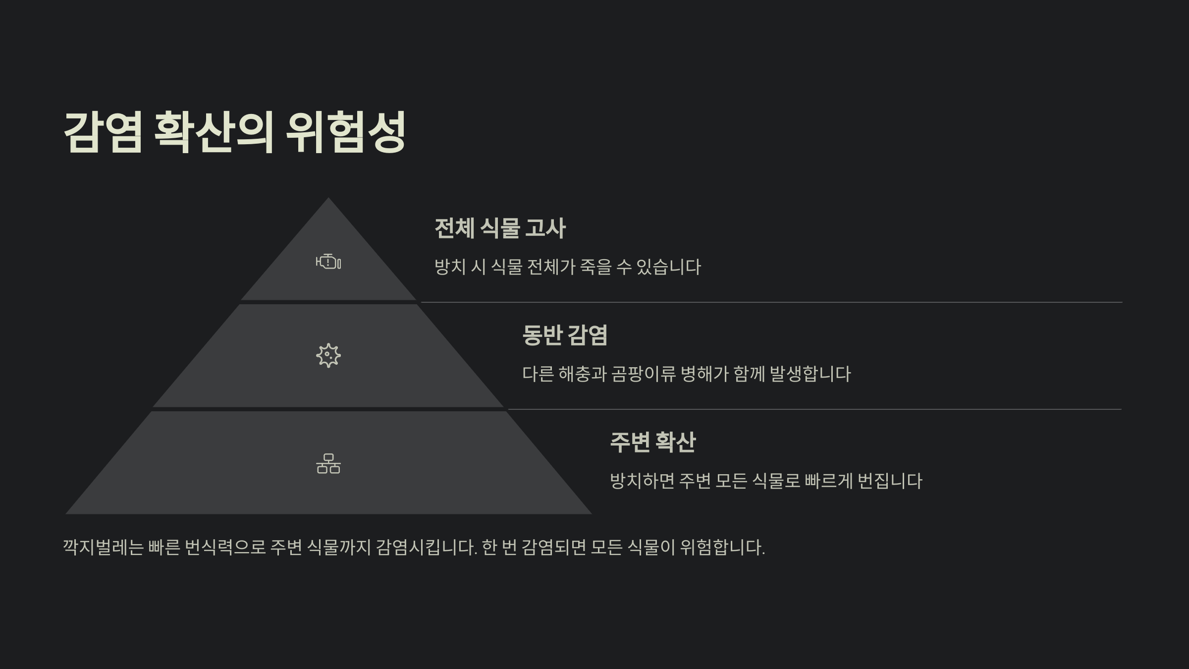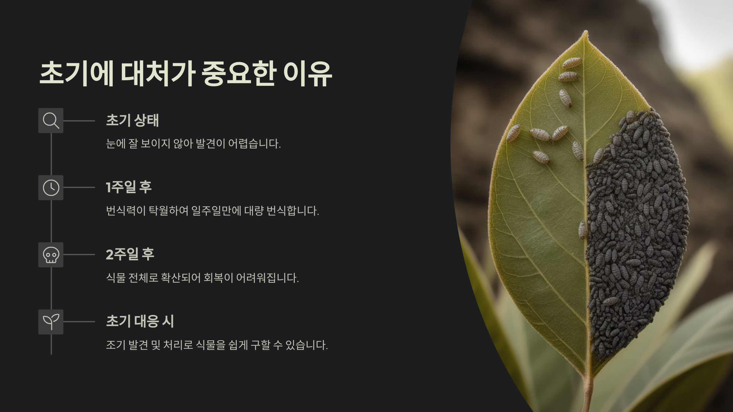 이 녀석들은 식물의 줄기, 잎, 심지어 뿌리까지 공격해서 식물을 점점 쇠약하게 만들어요. 즙액을 빨아먹히면 잎이 누렇게 변하거나 성장이 멈추고, 심하면 식물 전체가 말라죽기도 해요. 게다가 깍지벌레의 배설물은 끈적끈적한 '감로'를 만드는데, 이 감로 때문에 잎이 번들거리고 곰팡이가 피어 검게 변하는 '그을음병'을 유발하기도 한답니다. 으, 생각만 해도 끔찍하죠?