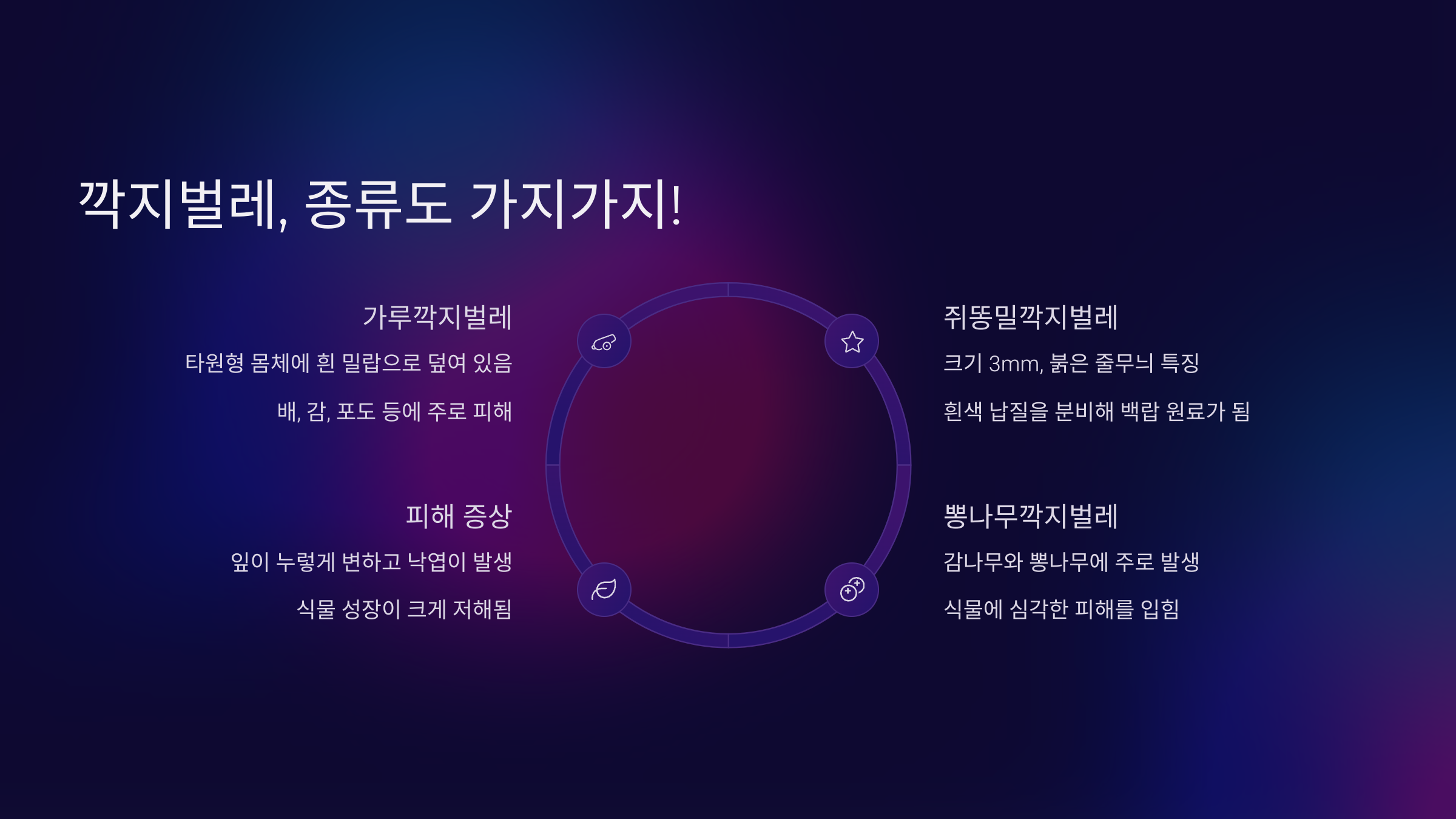 깍지벌레는 전 세계적으로 수천 종이 넘을 정도로 종류가 매우 다양해요. 우리나라에서 주로 발견되는 대표적인 깍지벌레 몇 가지를 알아볼까요?