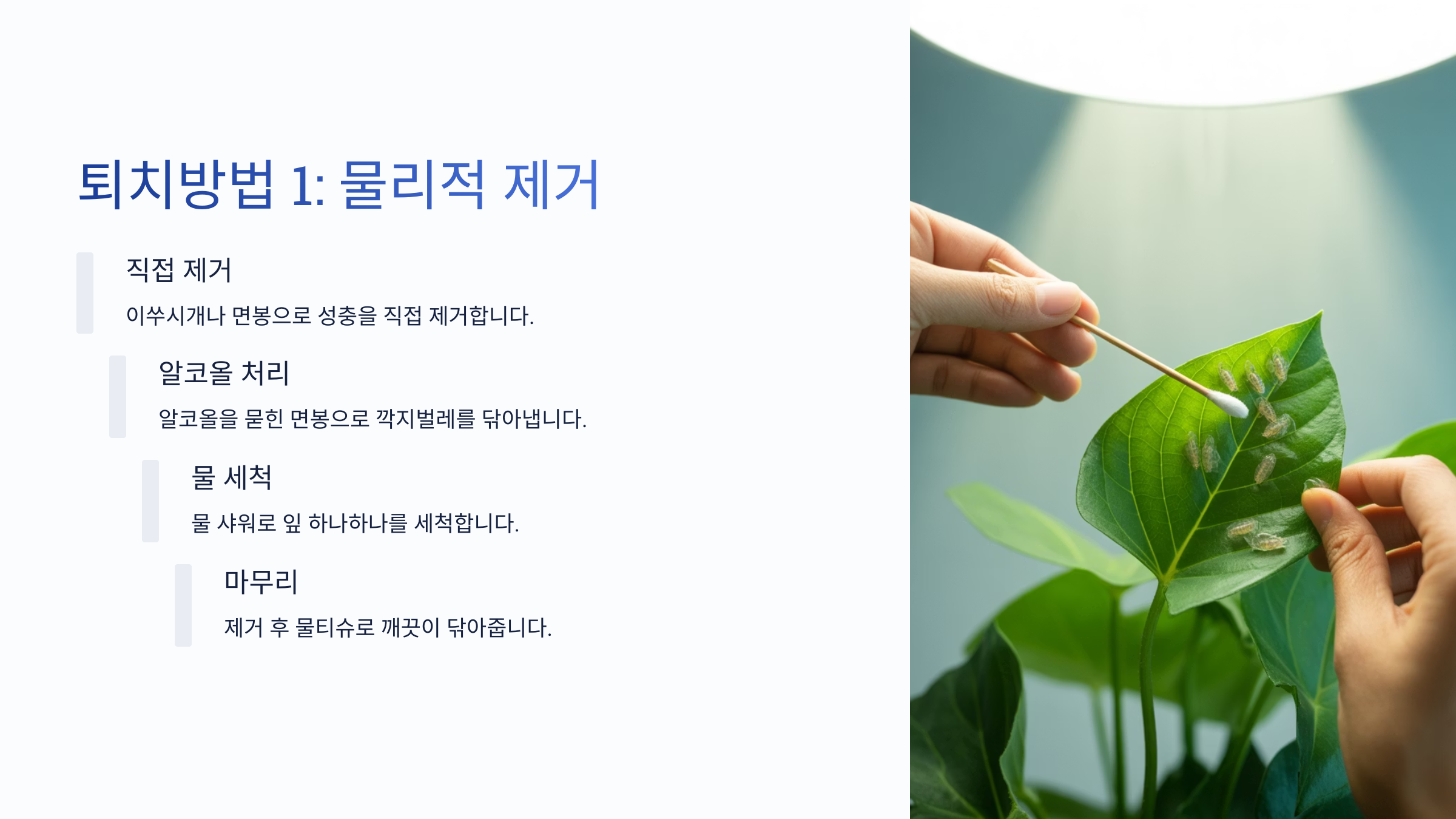 화학 농약을 사용하기 전에 시도해 볼 수 있는 친환경적인 방제법들이에요. 한 번에 완벽하게 퇴치되지는 않을 수 있지만, 꾸준히 반복하면 효과를 볼 수 있답니다.