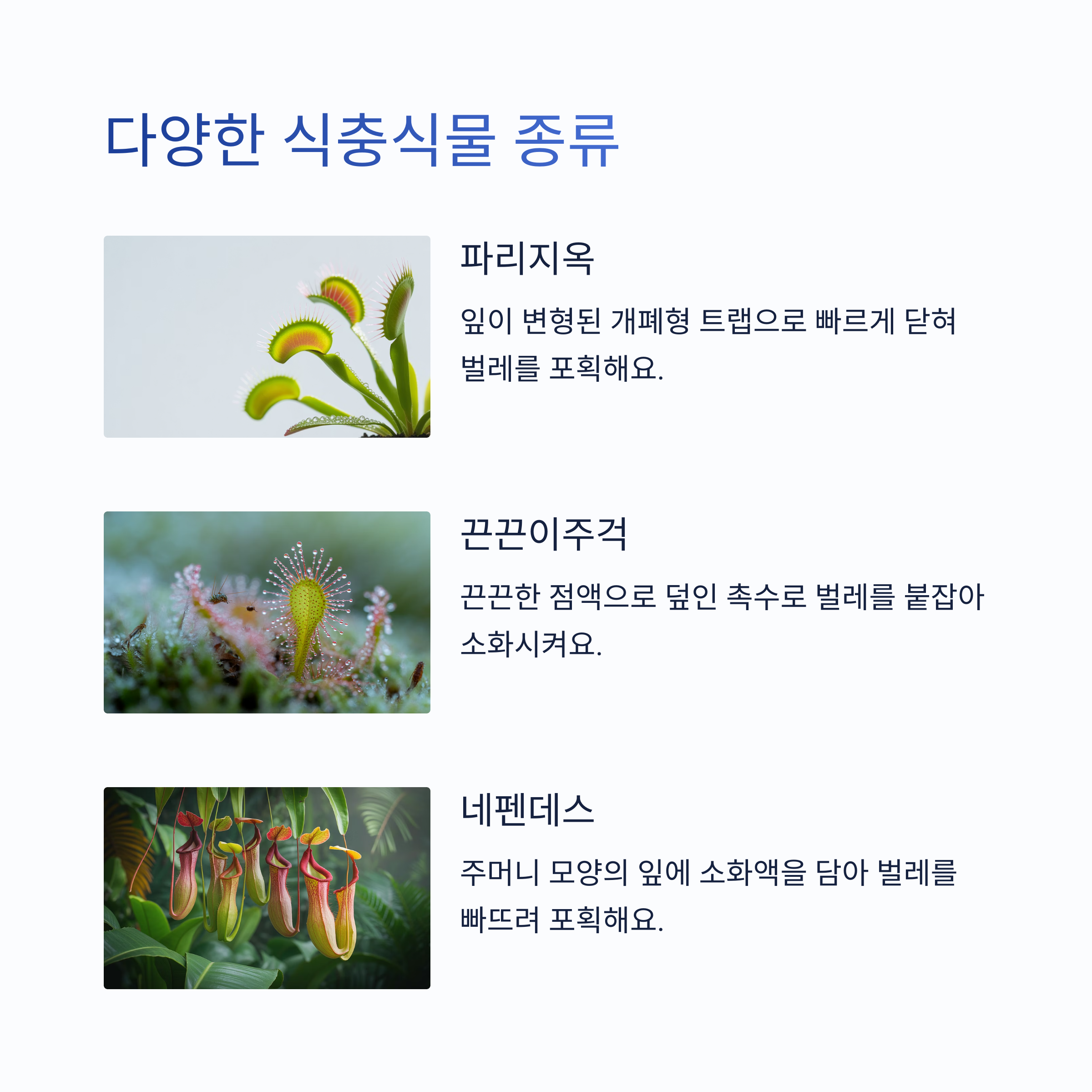 | 끈끈이주걱 (Sundew) | 끈끈이형 (Flypaper Trap) | 잎 표면의 끈끈한 액체로 벌레를 붙여요. 이슬처럼 맺힌 모습이 아름다워요. |