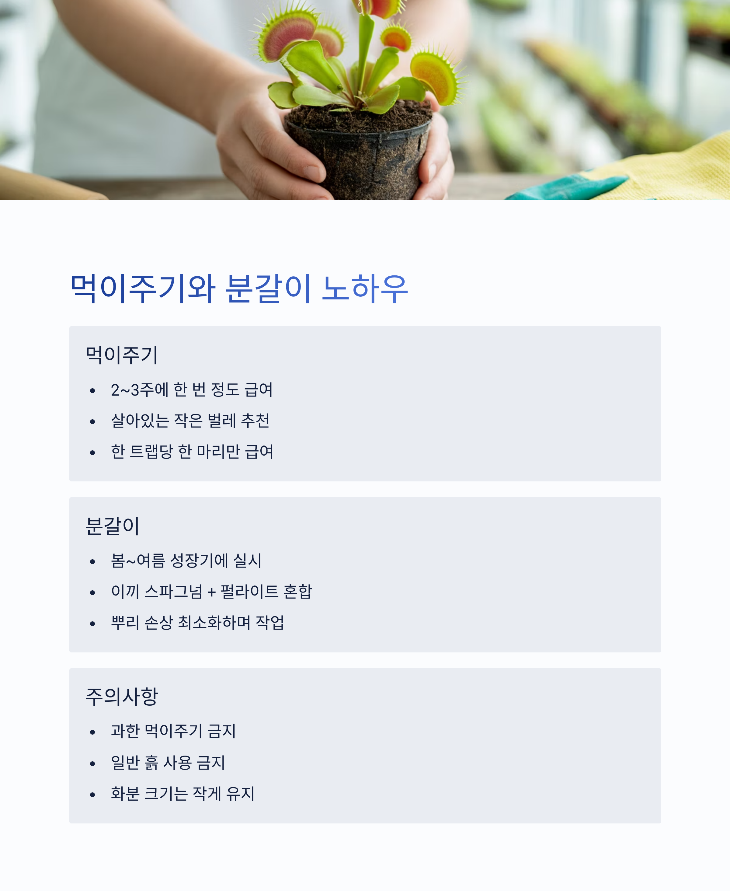 파리지옥의 가장 큰 매력 포인트! 바로 먹이 사냥이죠. 먹이주기와 건강한 성장을 위한 분갈이 방법에 대해 알아볼게요.