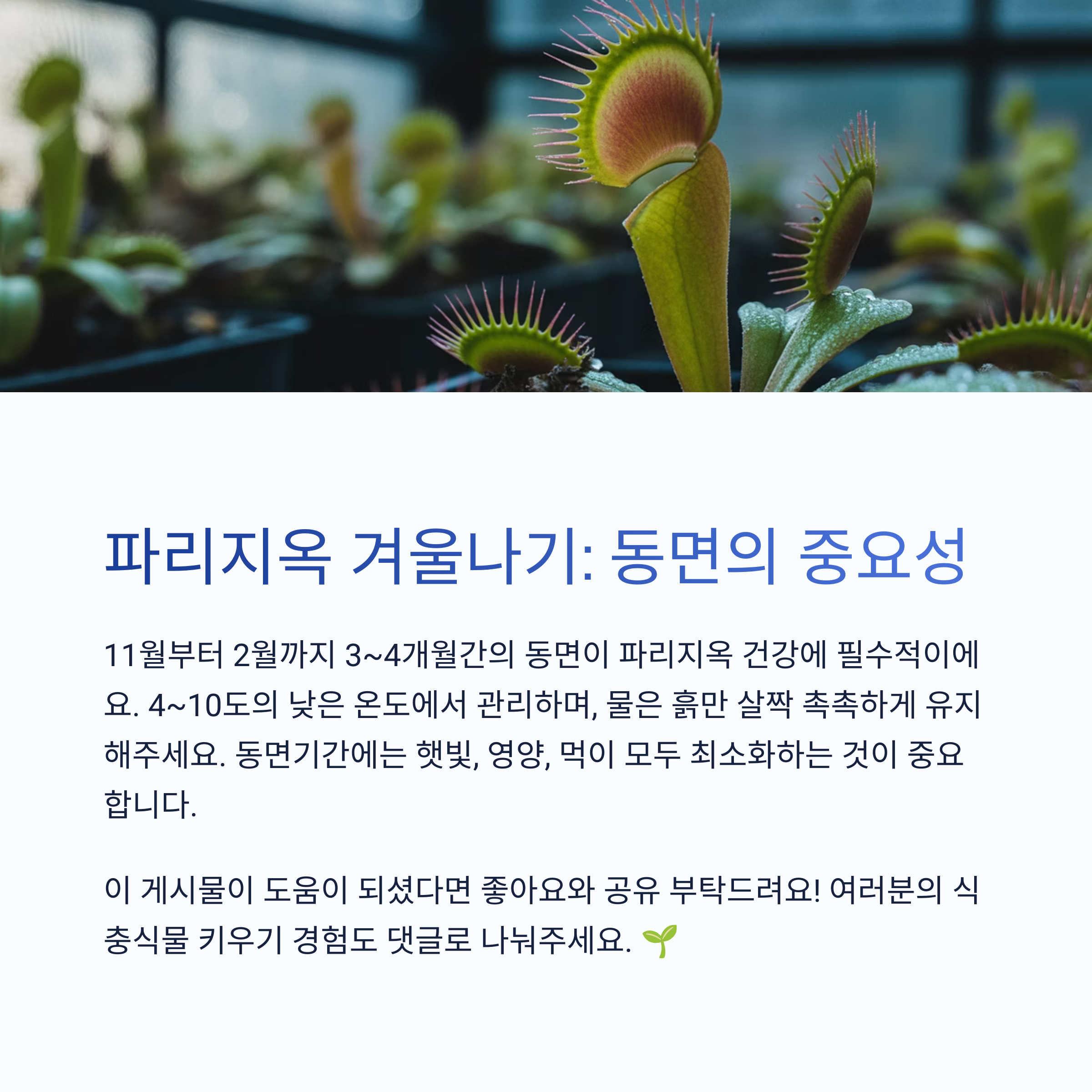 많은 초보 식집사들이 파리지옥 키우기에 실패하는 가장 큰 이유가 바로 '동면'을 시키지 않아서예요. 파리지옥은 건강하게 오래 살기 위해 겨울잠, 즉 동면이 반드시 필요하답니다.