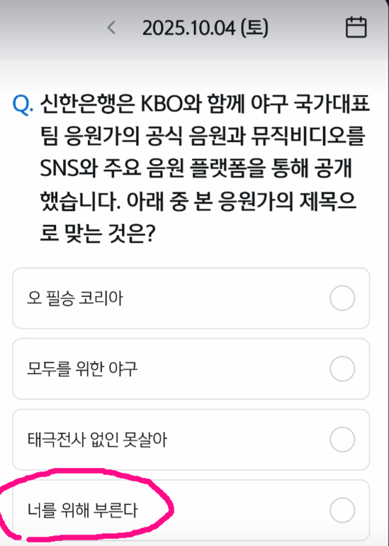 신한 SOL뱅크 앱 홈 화면 하단의 쏠야구 메뉴로 이동한 뒤, 쏠퀴즈를 선택합니다. - 퀴즈 정답 입력