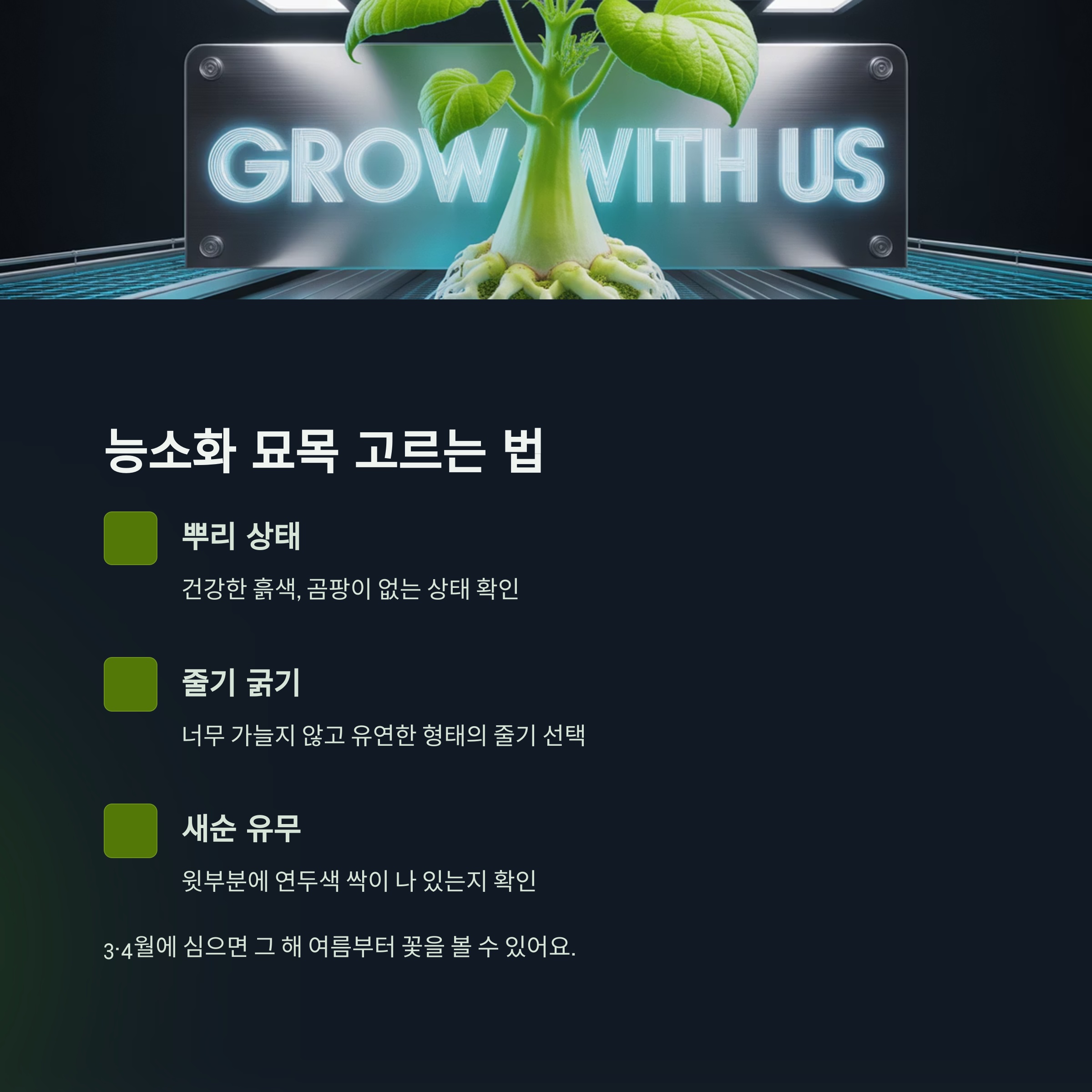 | 새순 유무 | 윗부분에서 연두색 싹이 나 있는지 확인 |