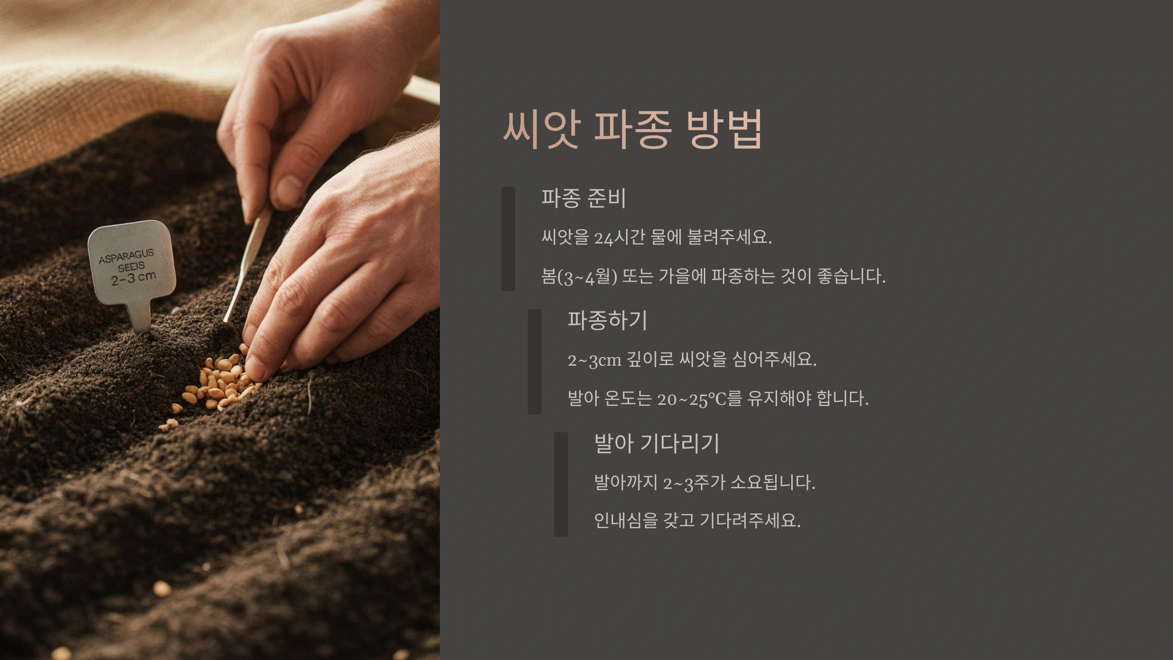 - 씨앗 불리고 파종: 아스파라거스 씨앗은 껍질이 단단해 발아가 잘 안 될 수 있어요. 파종 전날 미지근한 물에 담가 불려두면 발아율을 높일 수 있습니다. 3~4월경, 포트에 상토를 채우고 1~2cm 깊이로 씨앗을 2~3개씩 심어줍니다.