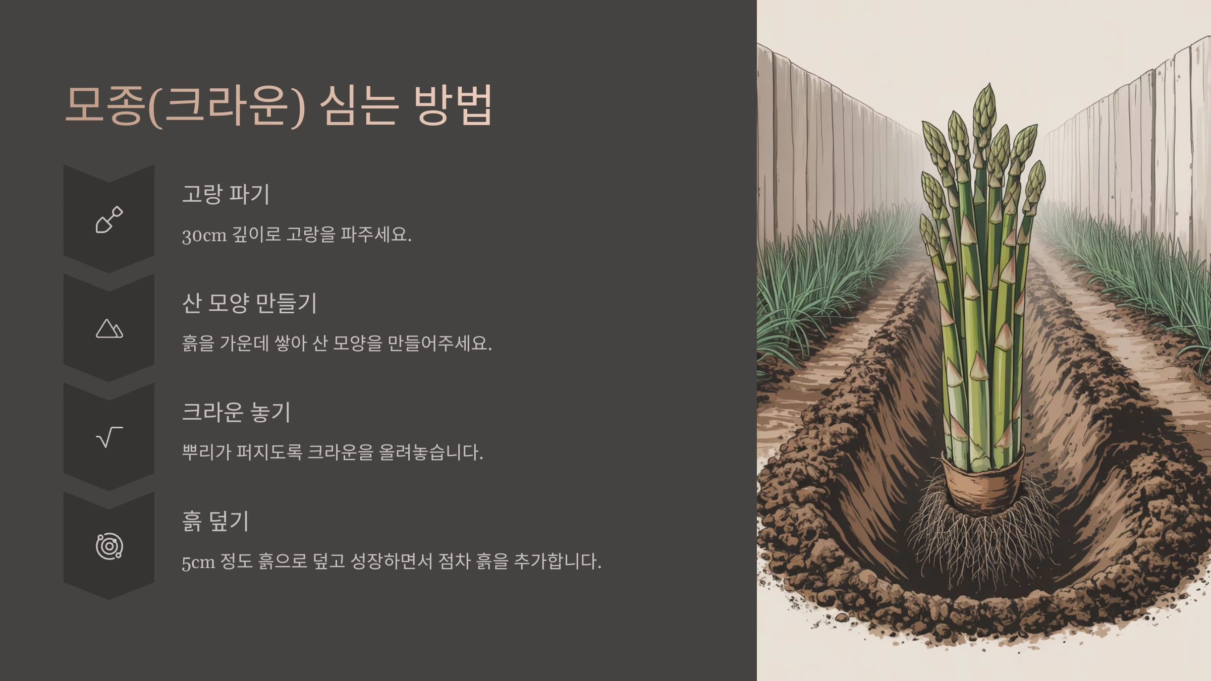 모종으로 시작하면 아스파라거스 키우기가 훨씬 수월해집니다. 보통 2년생 뿌리(크라운)를 구매해서 심게 되며, 심은 지 2년째(총 3년생)부터 본격적인 수확이 가능해요.