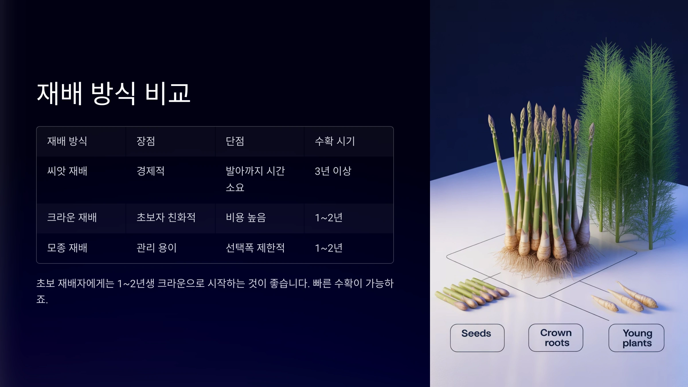 아스파라거스 재배는 크게 두 가지 방법으로 시작할 수 있어요. 바로 '씨앗'으로 시작하는 것과 '모종(크라운)'으로 시작하는 것이죠. 각각 장단점이 뚜렷해서 자신의 상황과 인내심(?)에 맞게 선택하는 것이 중요합니다.