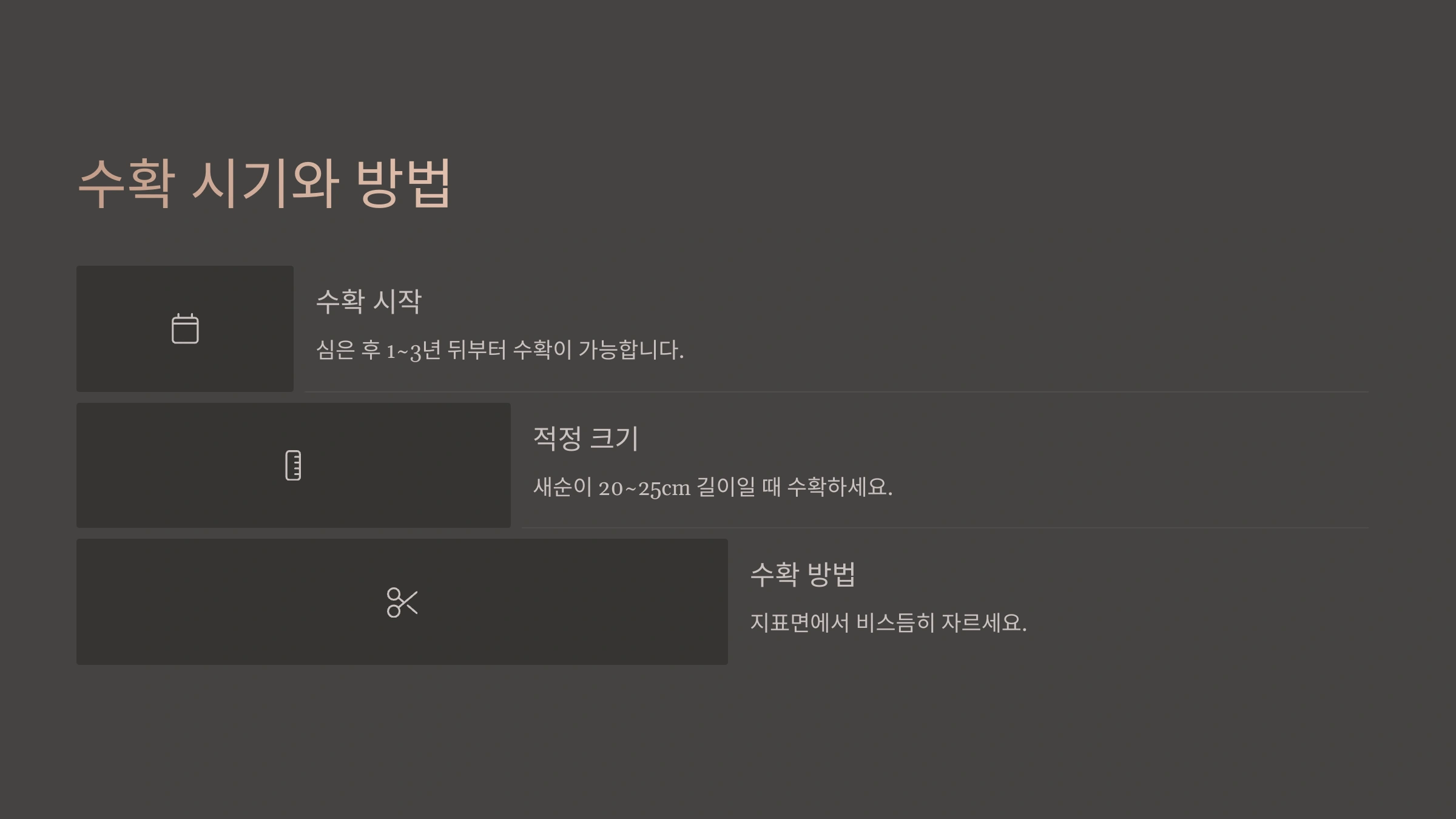 수확 중단 시점: 수확 기간이 끝나갈수록 올라오는 순의 굵기가 연필만큼 가늘어집니다. 이때는 수확을 멈추고 순을 그대로 길러서(입경) 다음 해를 위한 양분을 만들도록 해야 합니다.