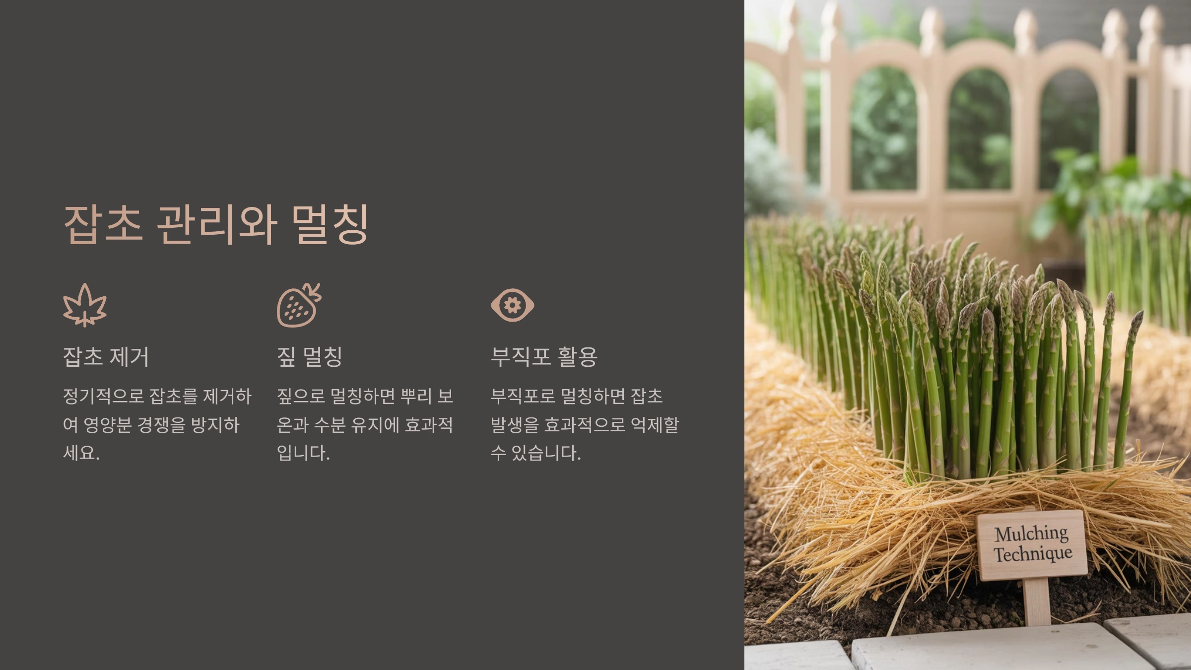 모종을 심은 첫해에는 절대 수확하면 안 돼요! 가늘게 올라오는 순은 그대로 두어 잎이 무성하게 자라도록 해야 합니다. 광합성을 통해 뿌리(크라운)에 양분을 충분히 저장해야 다음 해에 튼실한 아스파라거스가 올라오기 때문이죠. 이 기다림이 향후 10년의 수확을 좌우합니다!