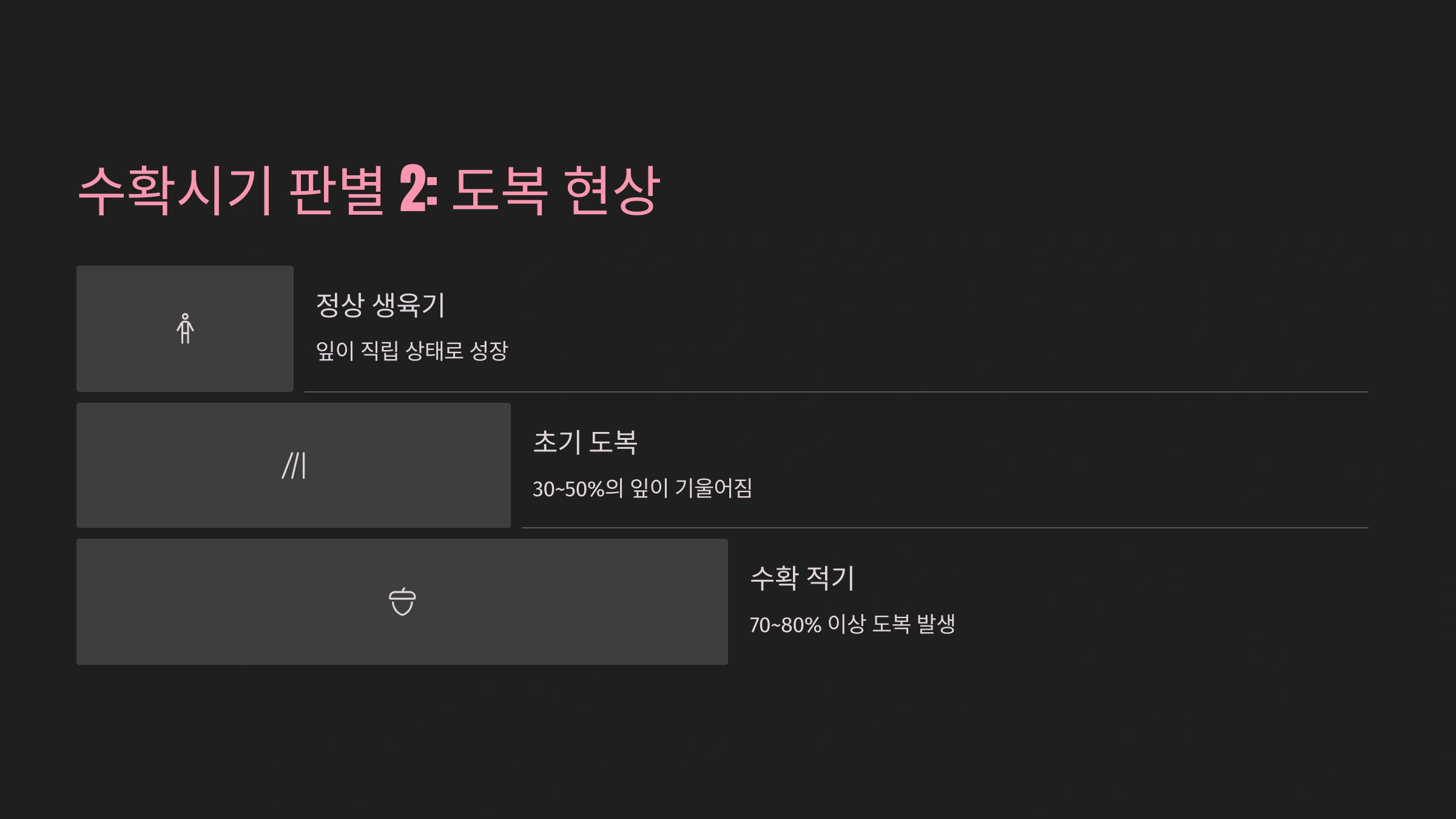 | 잎의 상태 | 전체 중 60~80% 쓰러짐 여부 | 자연스럽게 쓰러진 잎 다수 |