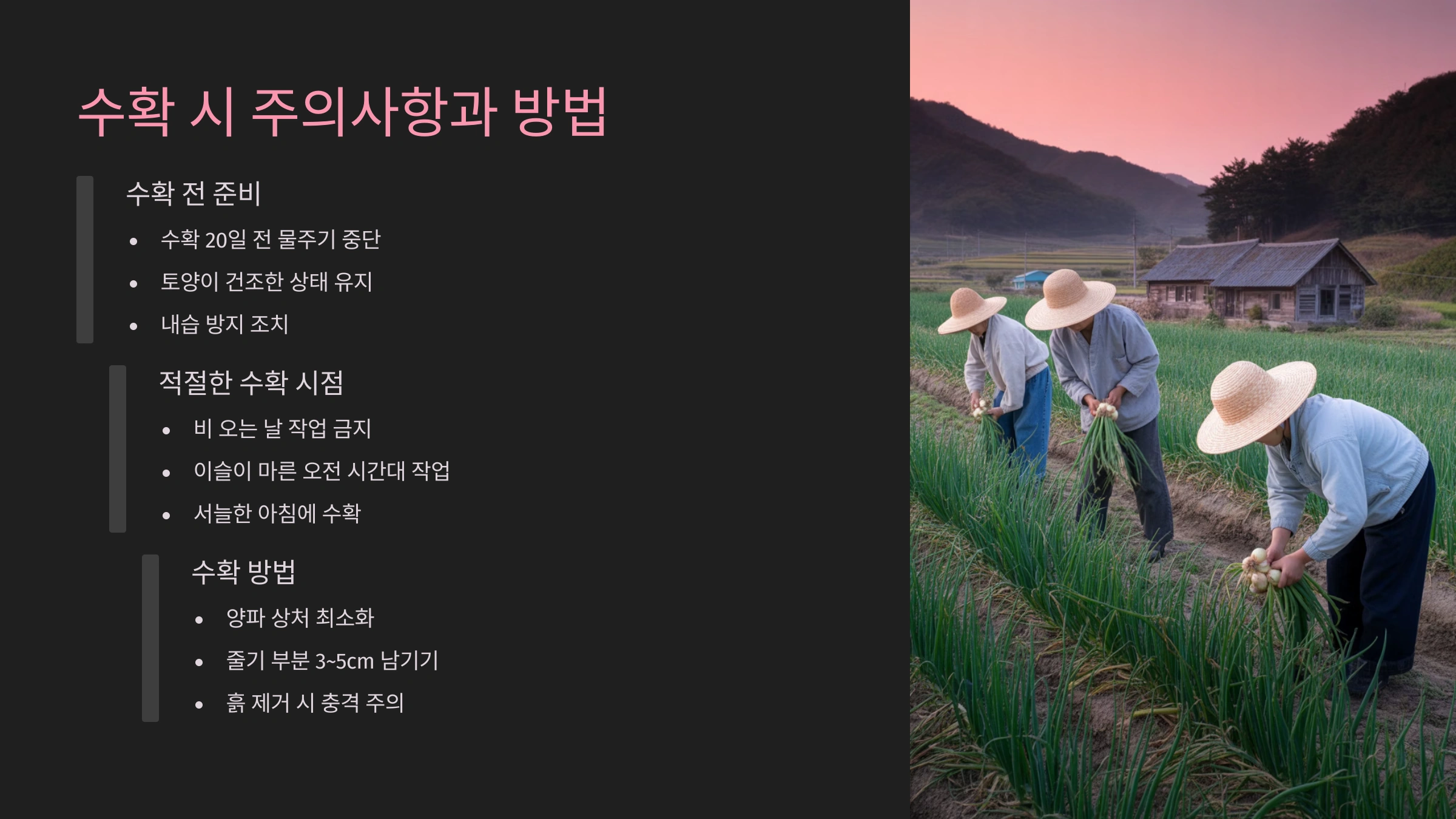 | 후기 수확 | 껍질 무름, 뿌리 썩음 | 빠르게 뽑아 그늘 말림 | 즉시 소비용 |