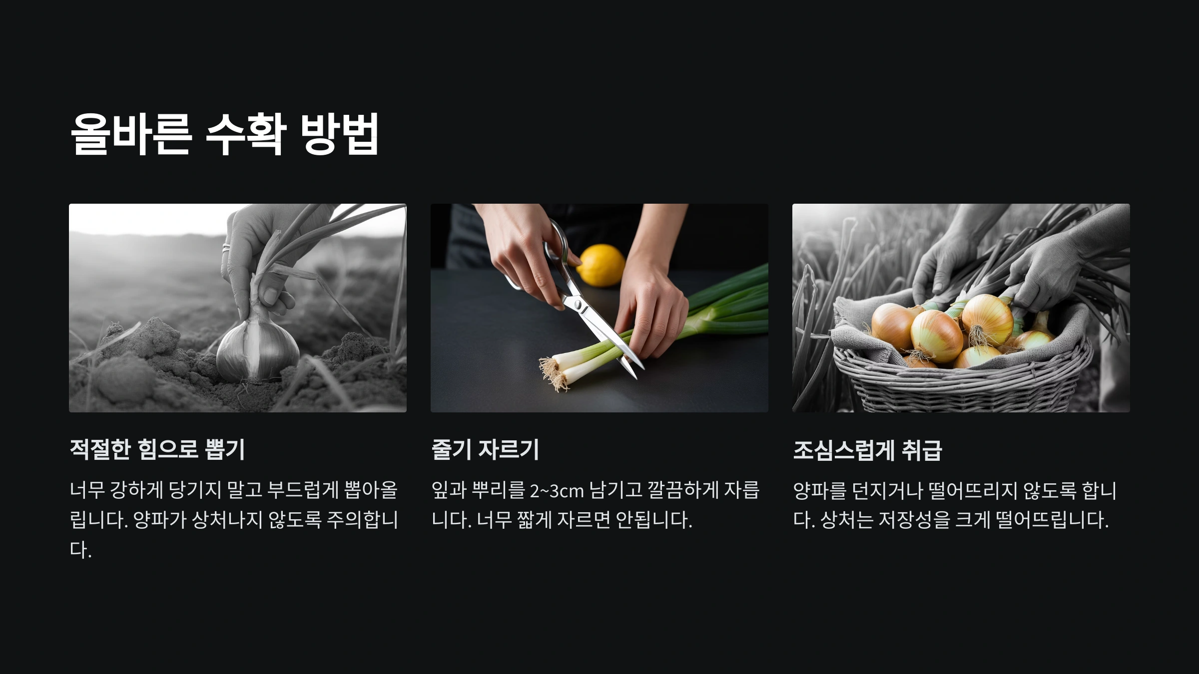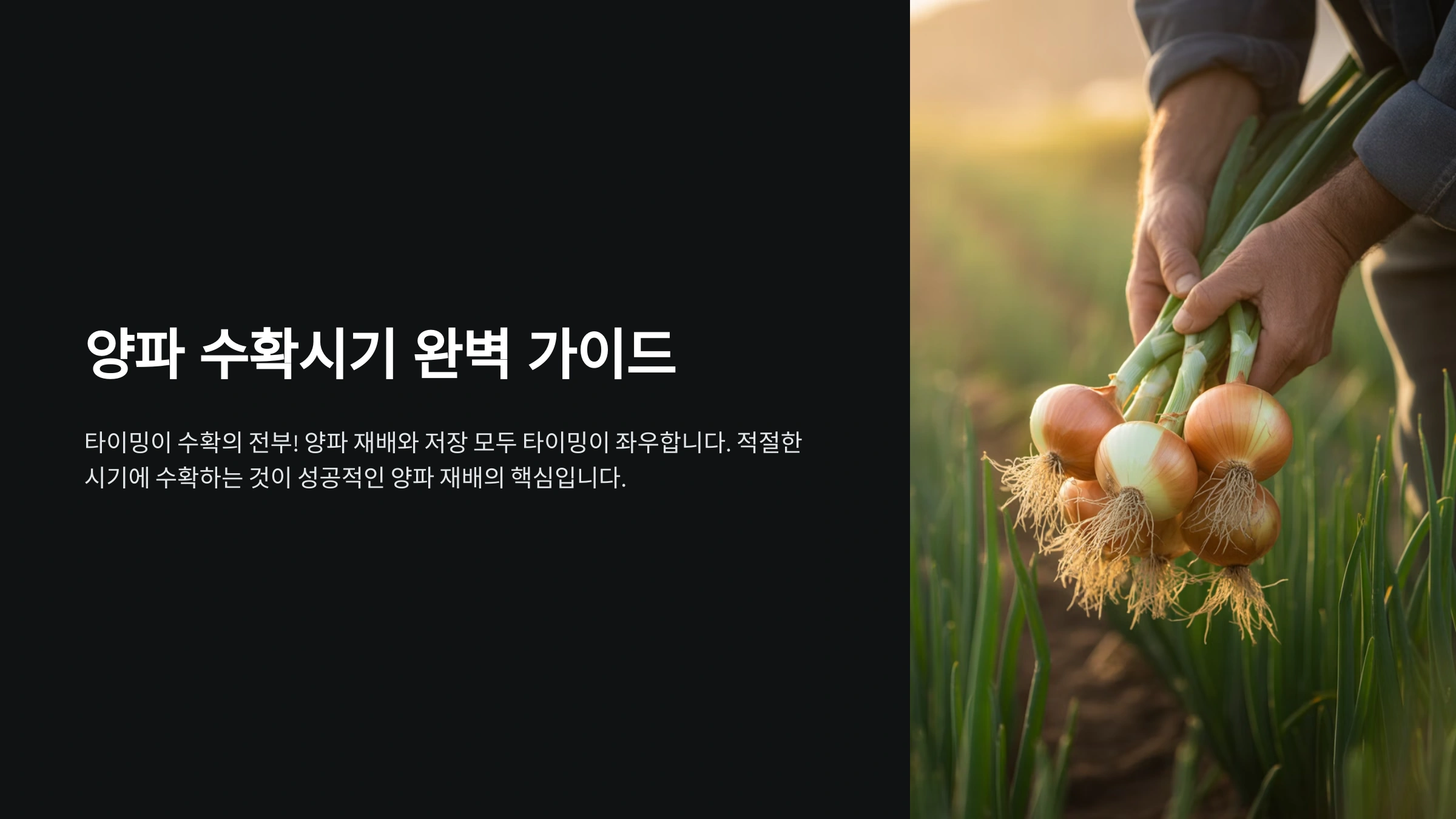 이제 양파 수확 시기를 보는 눈이 생기셨죠? 그렇다면 다음은 수확 시기에 따라 ‘어떻게’ 수확하느냐도 달라지거든요. 수확 방법도 알아야 완벽한 수확이 가능해요! 🍽️