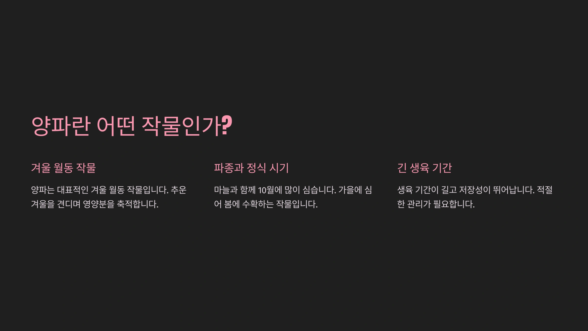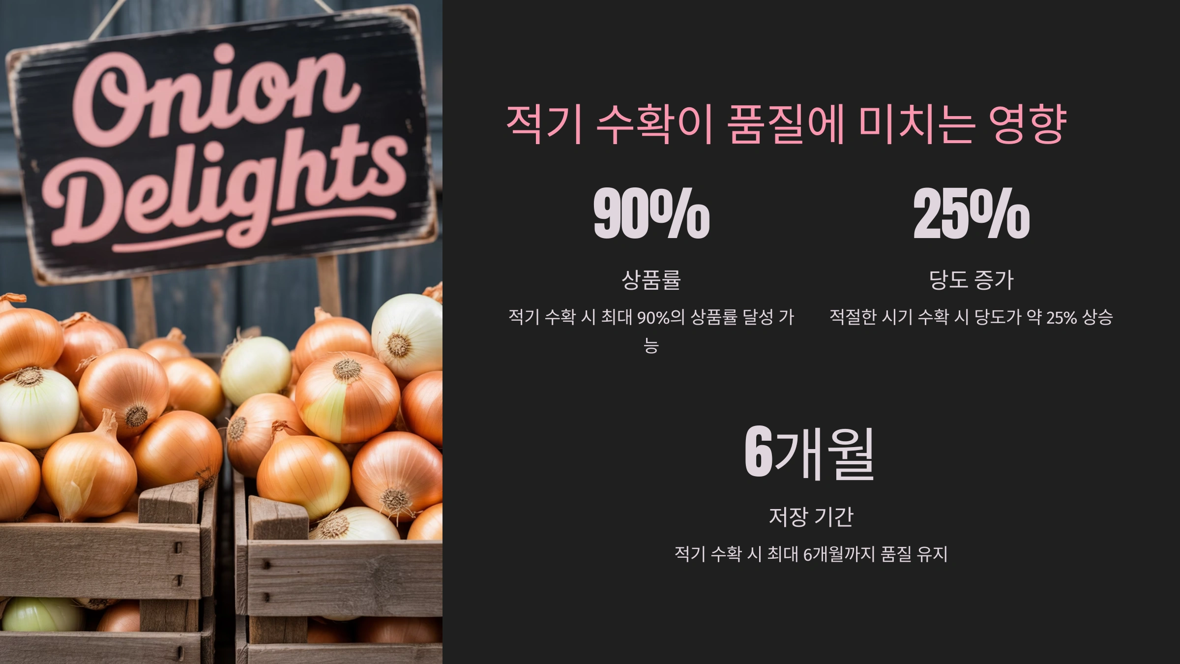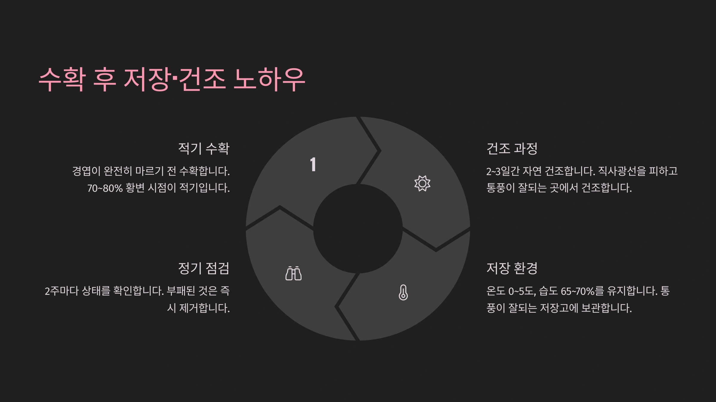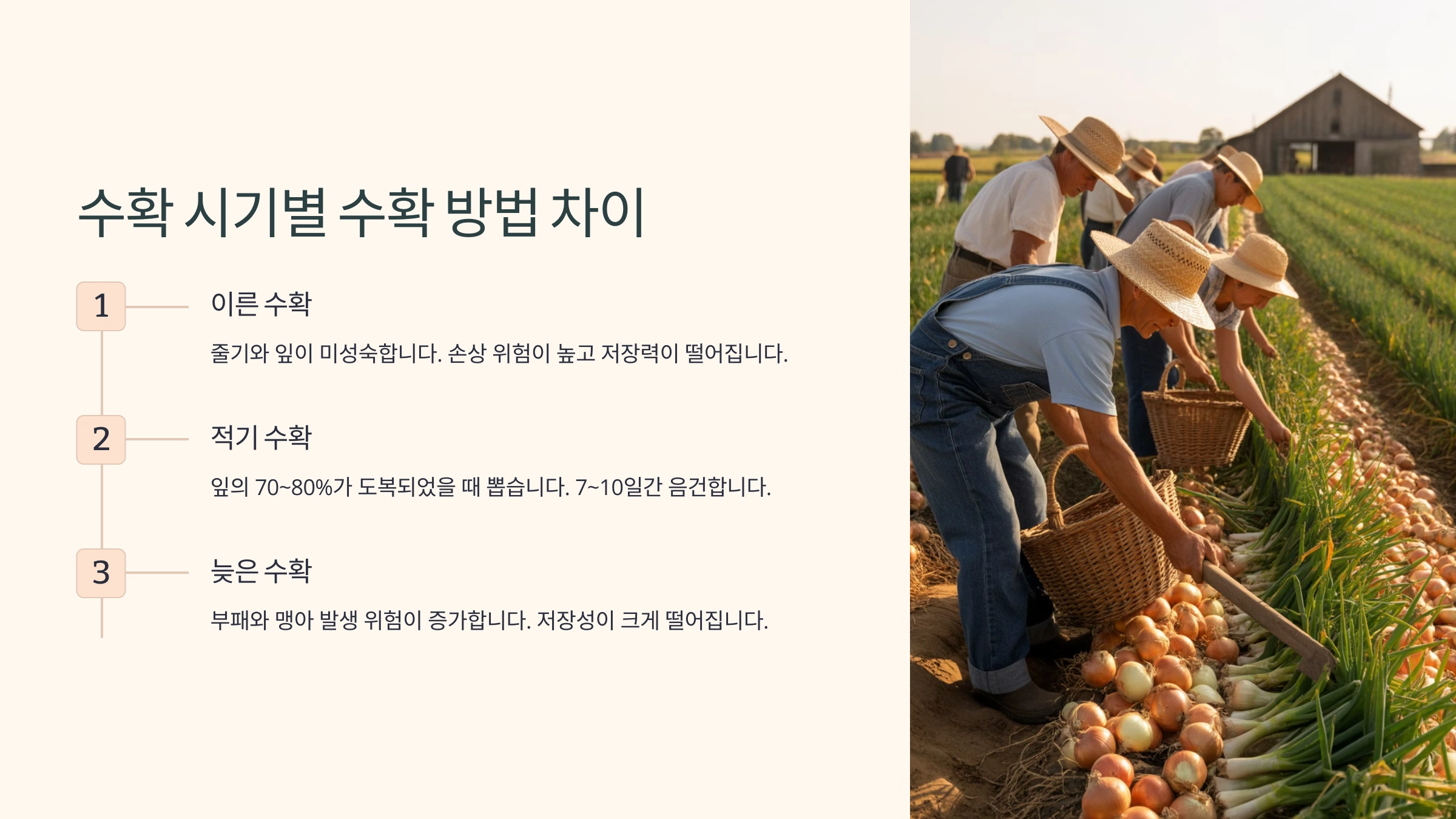 | 적기 수확 | 구 단단, 껍질 생김 | 손/포크로 자연스럽게 수확 | 저장, 유통, 보관 |