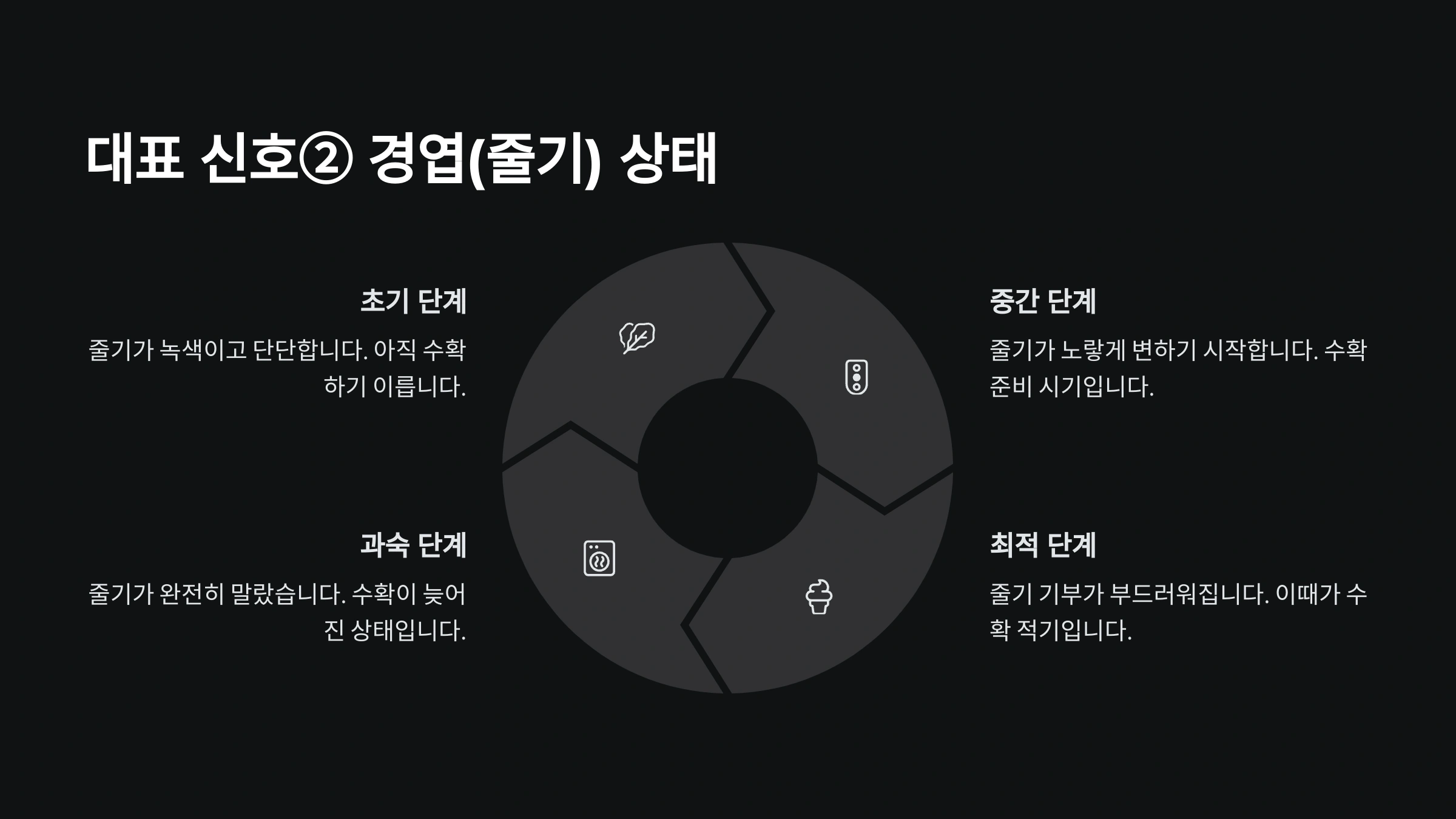 | 성숙기 | 4~5개월차 | 잎이 쓰러지고 수확 준비 완료 |