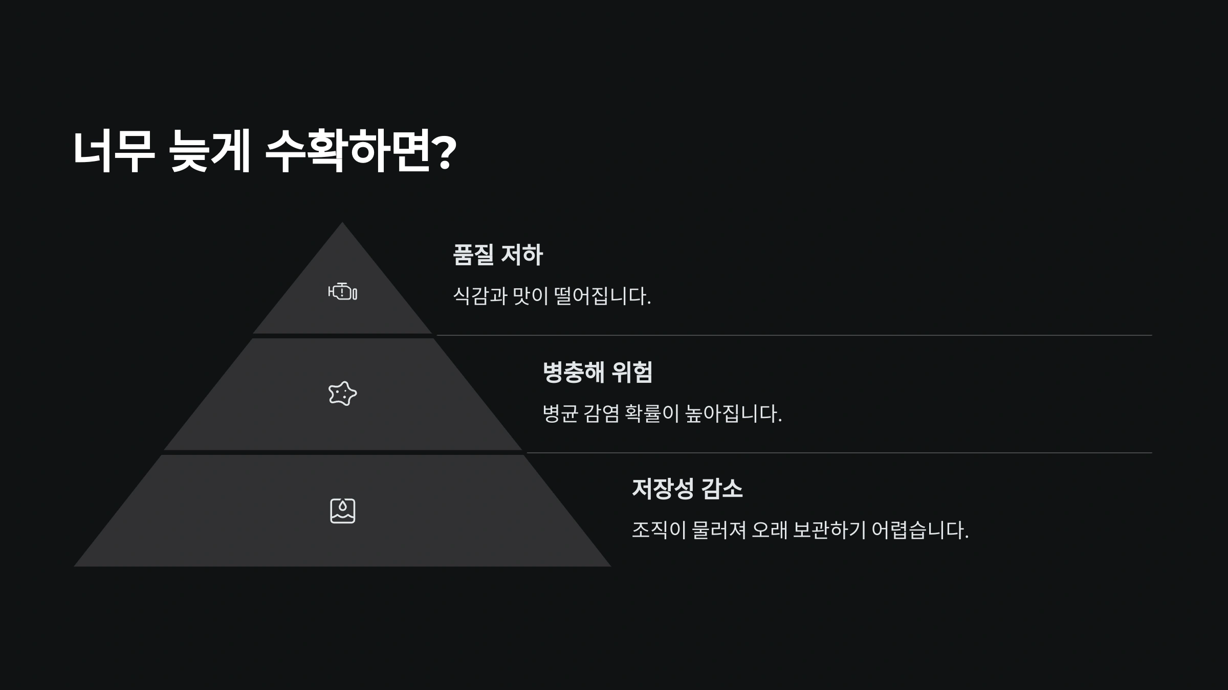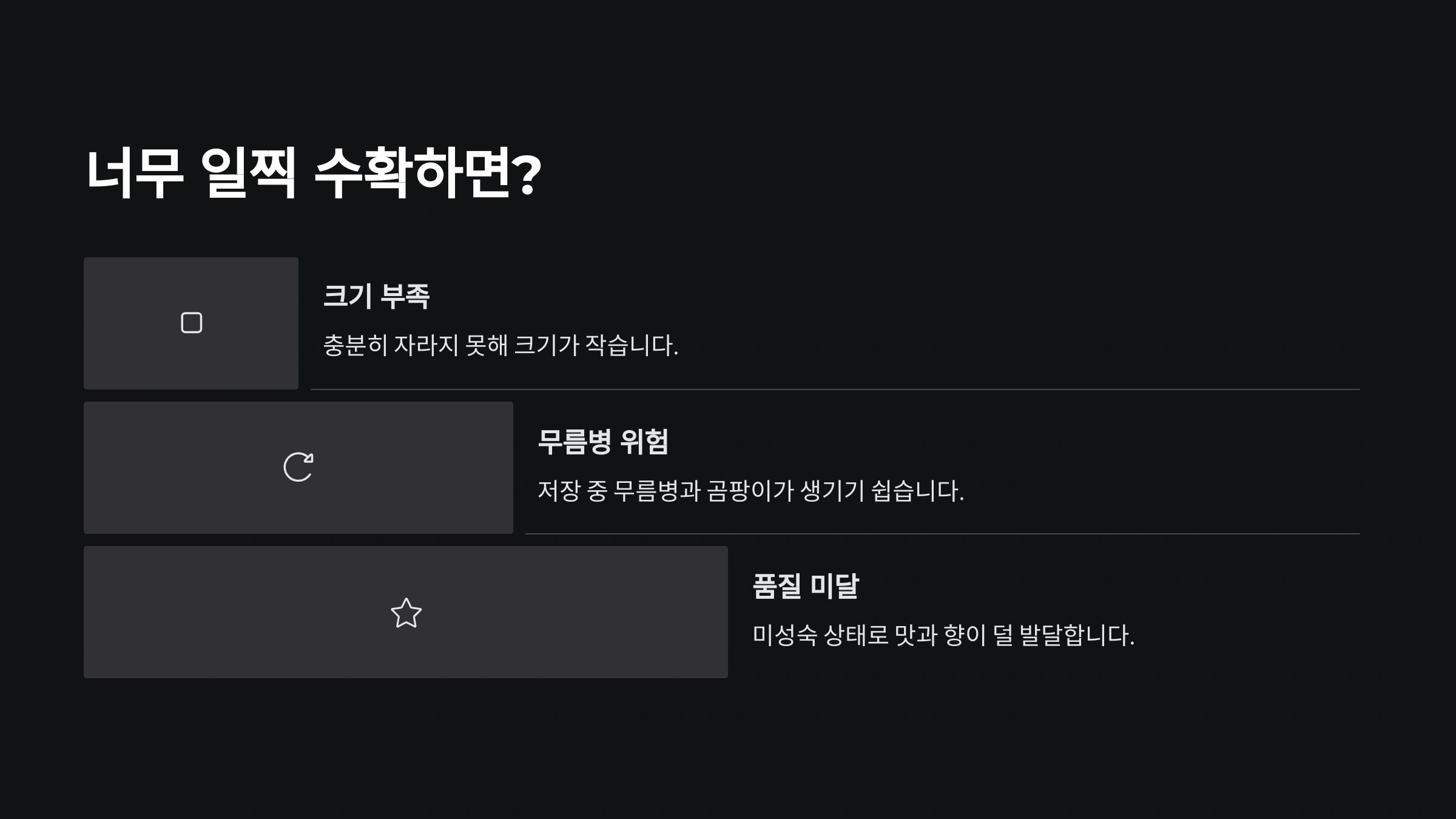 | 후기 수확 | 썩음, 무름, 곰팡이 | 보관 불가, 유통 중 손상 |