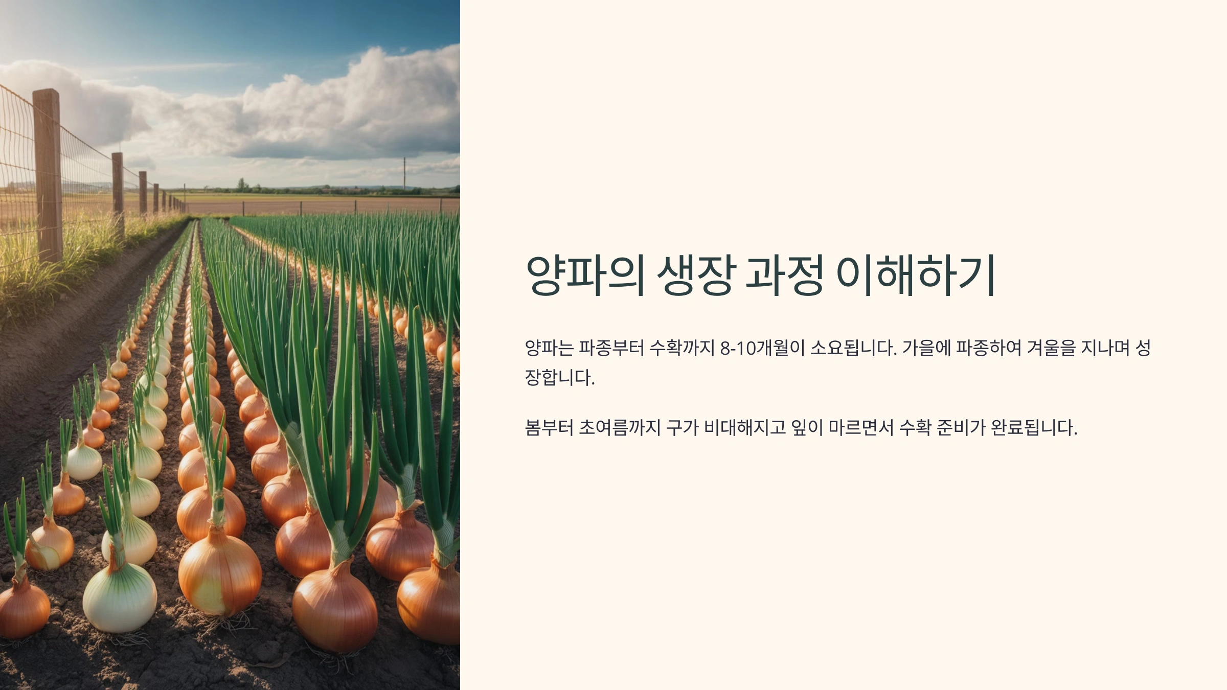 양파는 생각보다 복잡한 생장 단계를 거쳐 완성돼요. 우리가 식탁에서 쉽게 접하는 양파 한 알이 땅속에서 제대로 자라기 위해선 햇빛, 온도, 습도까지 모두 맞아야 해요. 생육 환경이 조금만 어긋나도 수확량이나 저장성에 큰 영향을 미치게 되죠.