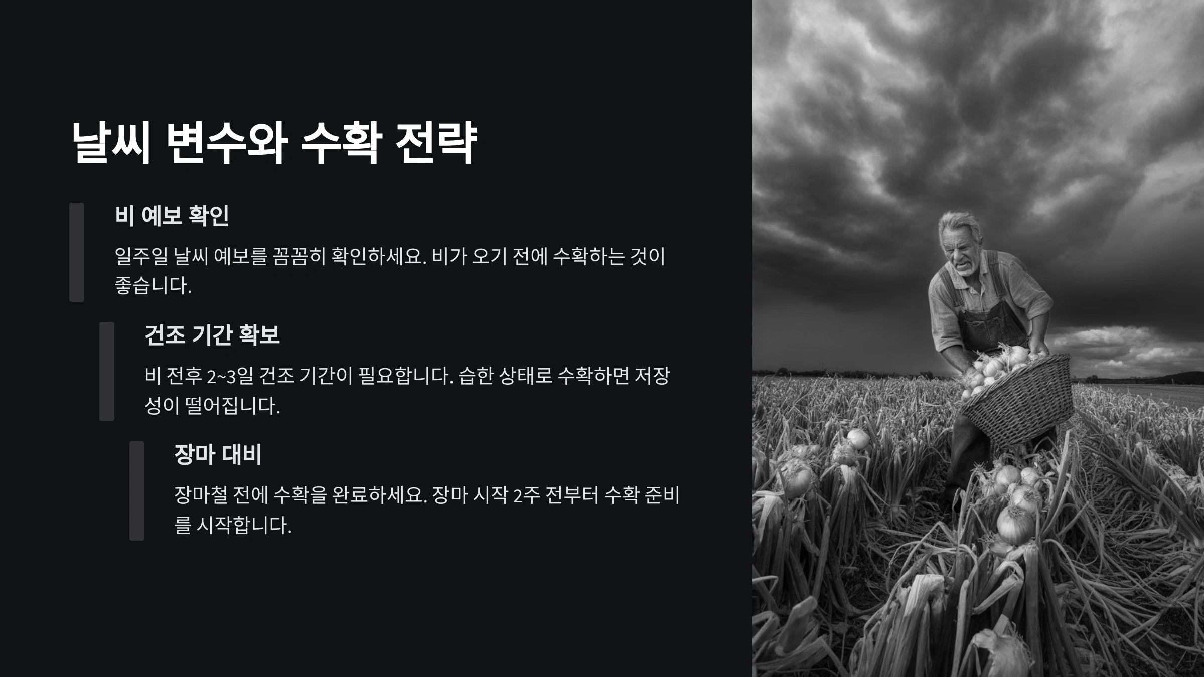 요즘은 기온이 들쑥날쑥해서 예전보다 수확 타이밍이 더 중요해졌어요. 특히 고온다습한 날씨가 이어질 때는 양파가 더 빨리 익어버리거나 썩을 수 있으니 주의가 필요하답니다. 날씨 체크도 습관처럼 하세요!