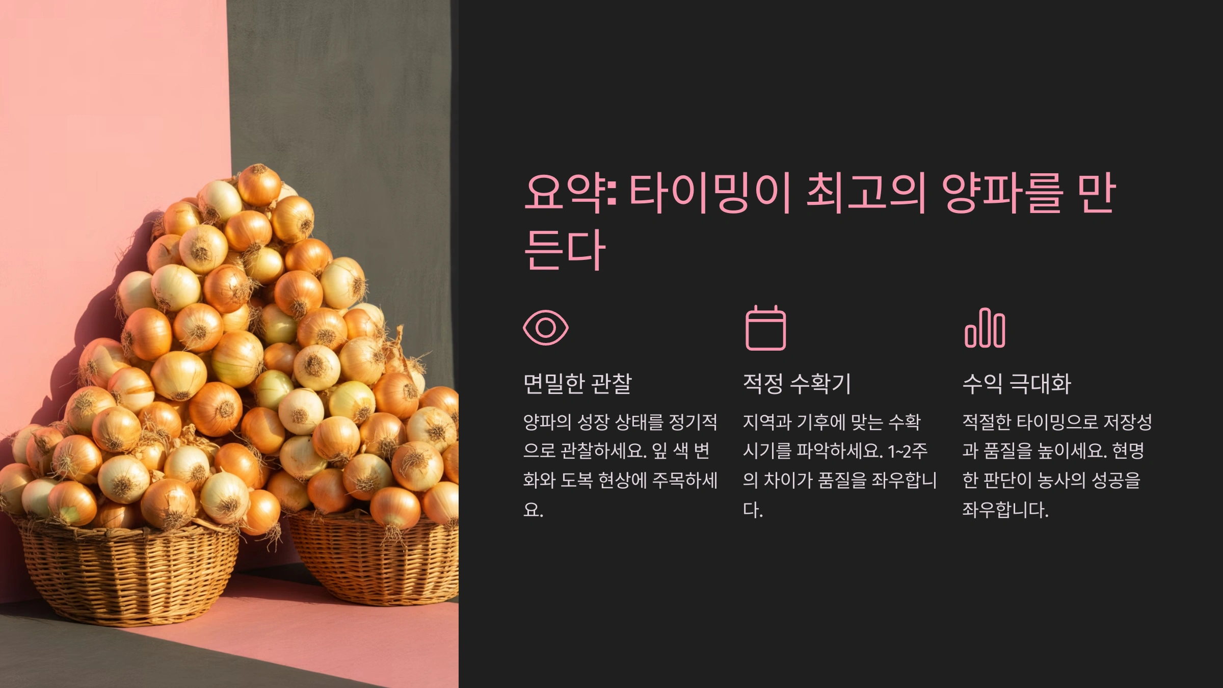 양파는 타이밍 작물이에요. 기온과 습도를 예의주시하면서 ‘지금이다!’ 싶은 순간을 포착하는 게 농사의 결정적 포인트예요. 내 지역의 수확 달력을 참고하되, 눈으로 직접 보고 느끼는 관찰력도 꼭 키워보세요.