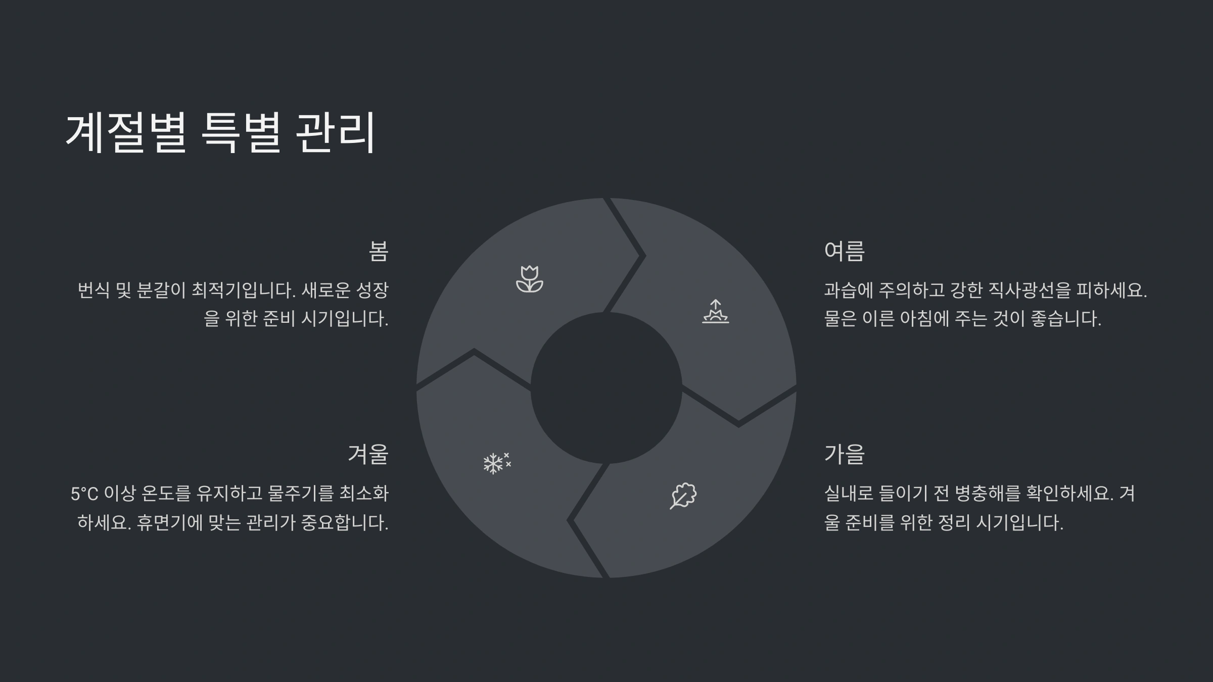 - 꽃대 관리: 꽃이 활짝 피고 나서 시들기 시작하면, 에너지가 씨앗을 만드는 데 쓰이지 않도록 꽃대를 과감하게 잘라주세요. 이리저리 흔들어 톡 부러뜨리거나 가위로 줄기 가장 아랫부분을 잘라주면, 그 에너지를 새로운 꽃대를 올리는 데 쓴답니다.