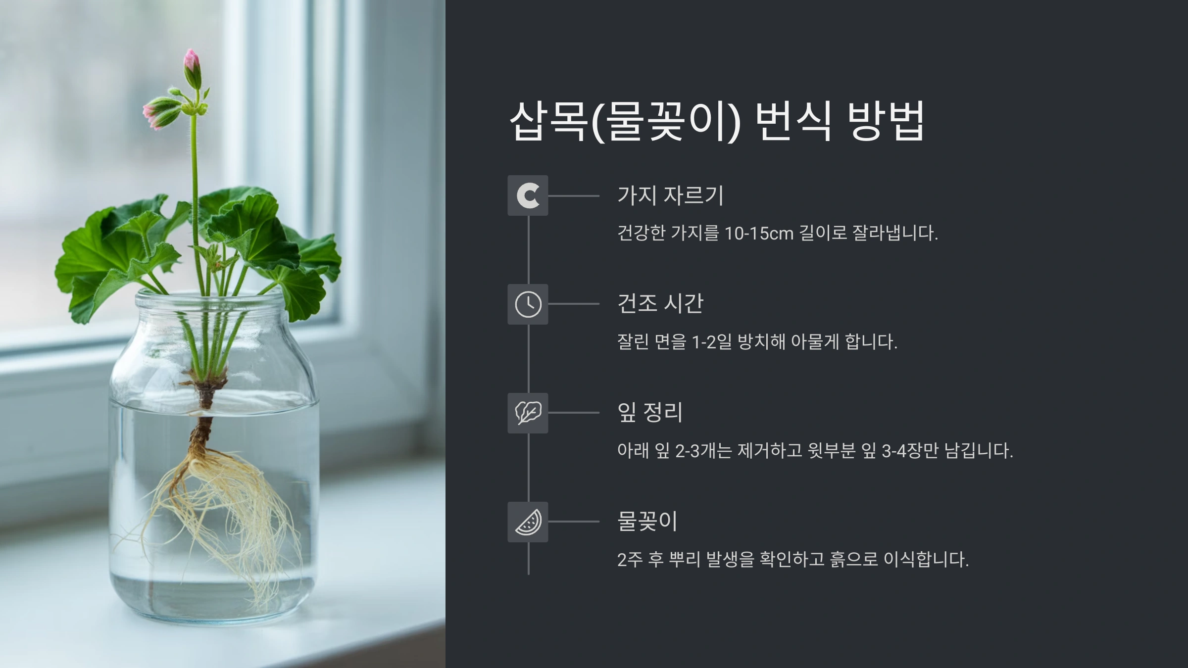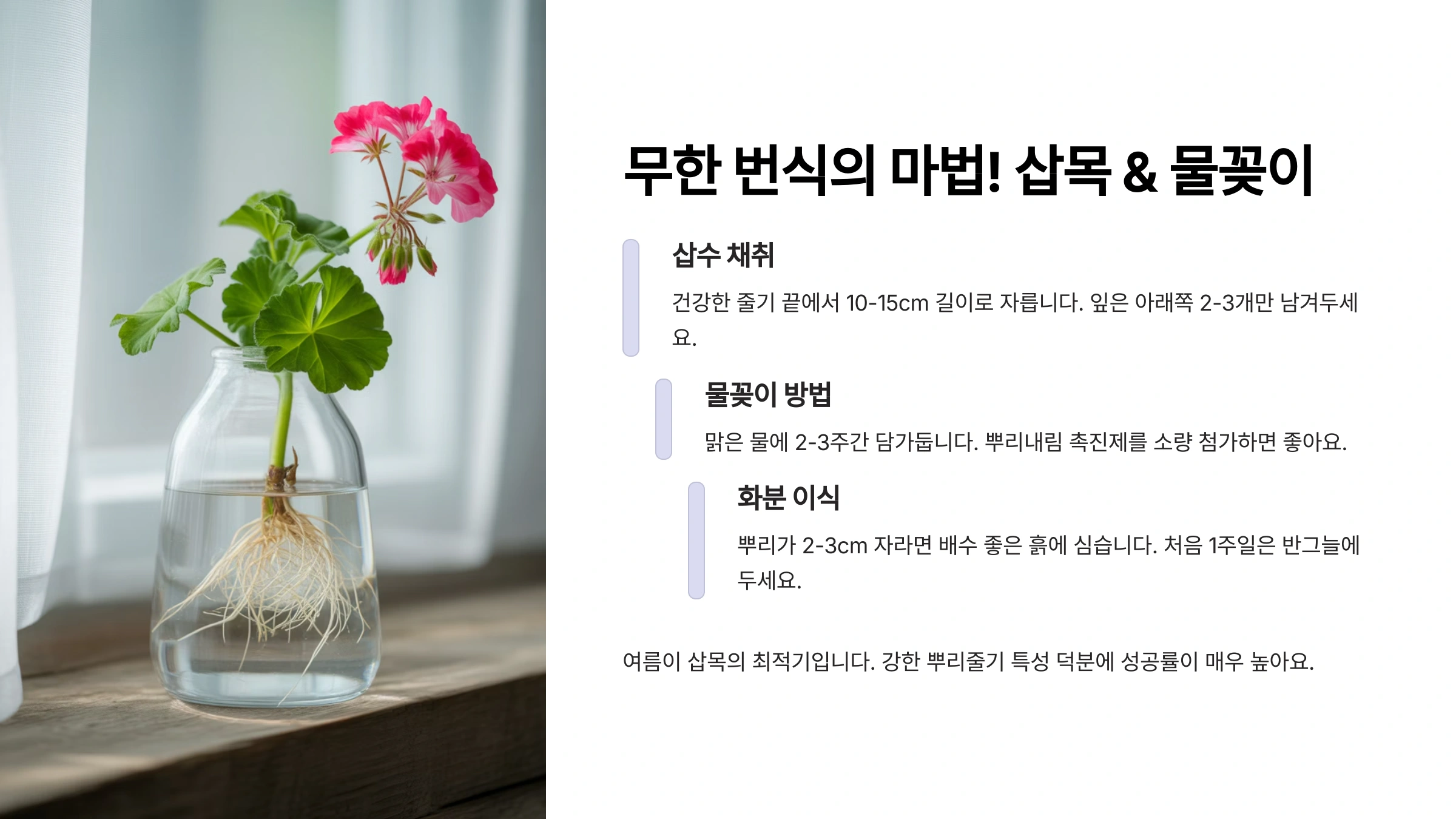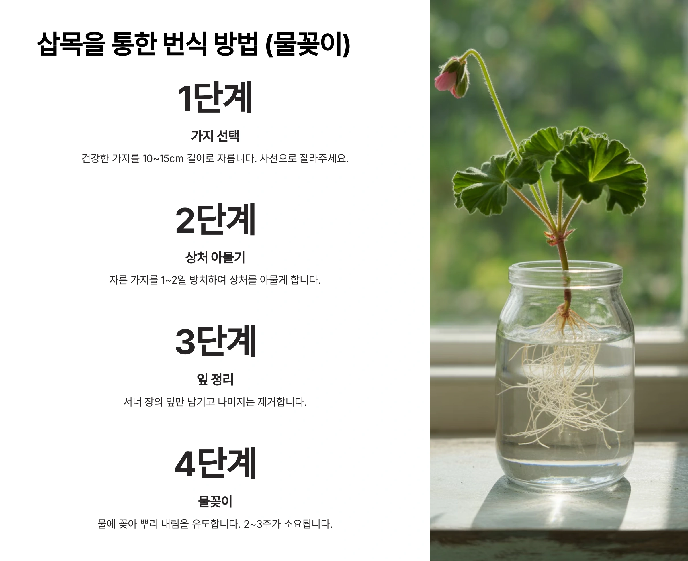 제라늄 키우기의 또 다른 재미는 바로 '번식'이에요. 가지치기하고 남은 줄기 하나로 새로운 개체를 만들 수 있죠. 번식은 성장이 왕성한 봄, 가을에 하는 것이 성공률이 가장 높아요.