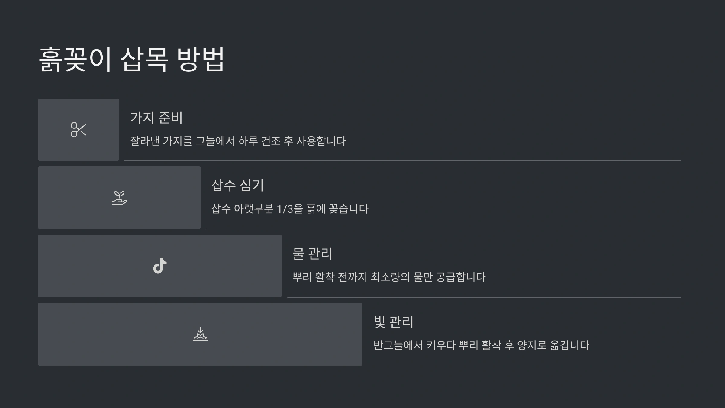 - 삽수 선택: 웃자람 없이 곧고 튼튼하게 자란 삽수를 준비해요.
