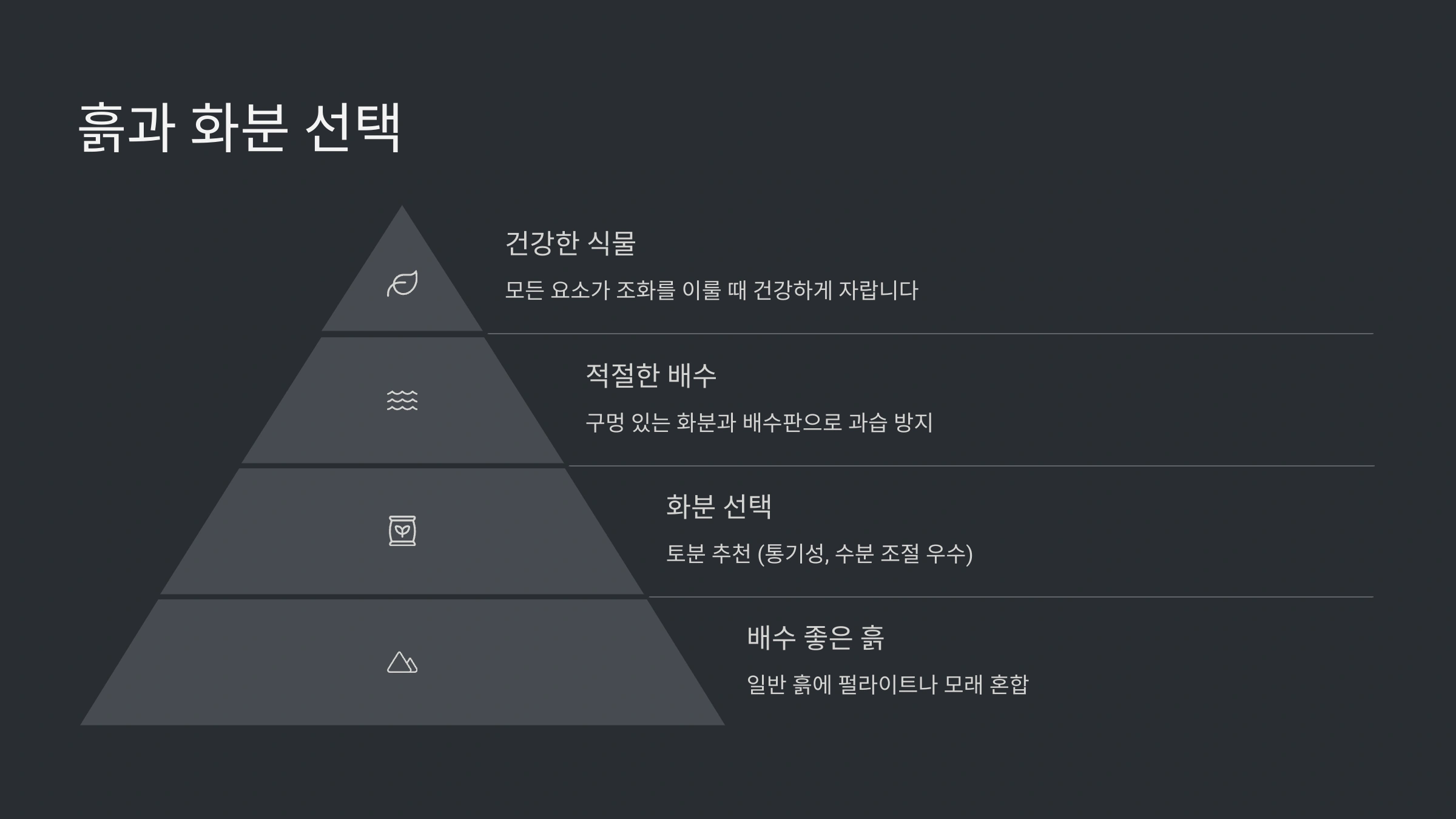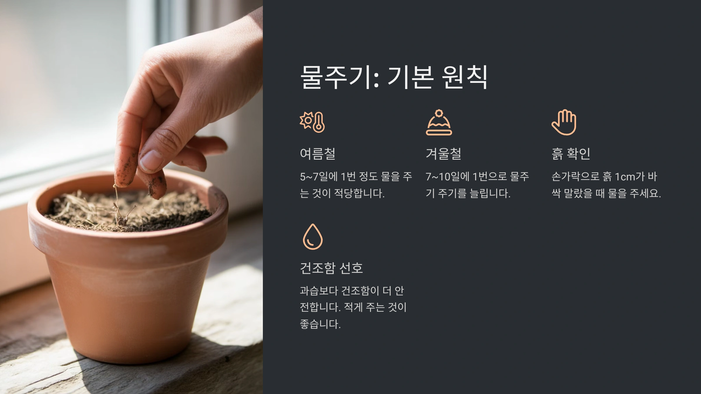 물주기 핵심 원칙은 바로 "겉흙이 마르고, 속흙까지 말랐을 때, 화분 밑으로 물이 흘러나올 만큼 흠뻑 주기"입니다. 식물을 말려 죽일까 봐 걱정돼서 매일 조금씩 물을 주는 것이 최악의 습관이에요. 과습은 뿌리를 썩게 하고 결국 무름병으로 식물을 떠나보내는 가장 큰 원인이 된답니다.