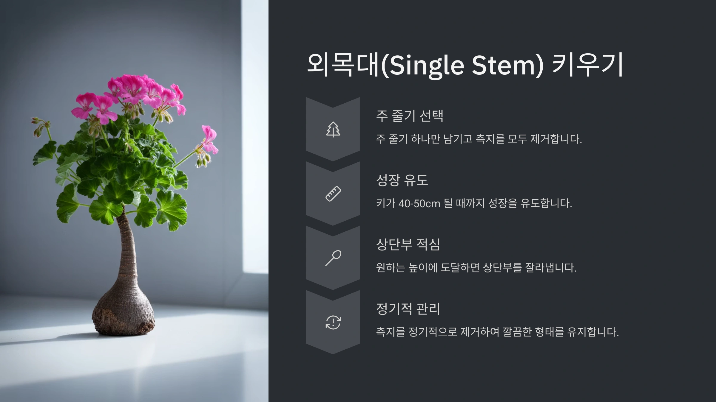 토피어리처럼 나무 모양으로 제라늄을 키우는 '외목대' 만들기는 많은 가드너들의 로망이죠. 시간과 정성이 필요하지만 완성했을 때의 만족감은 정말 크답니다.