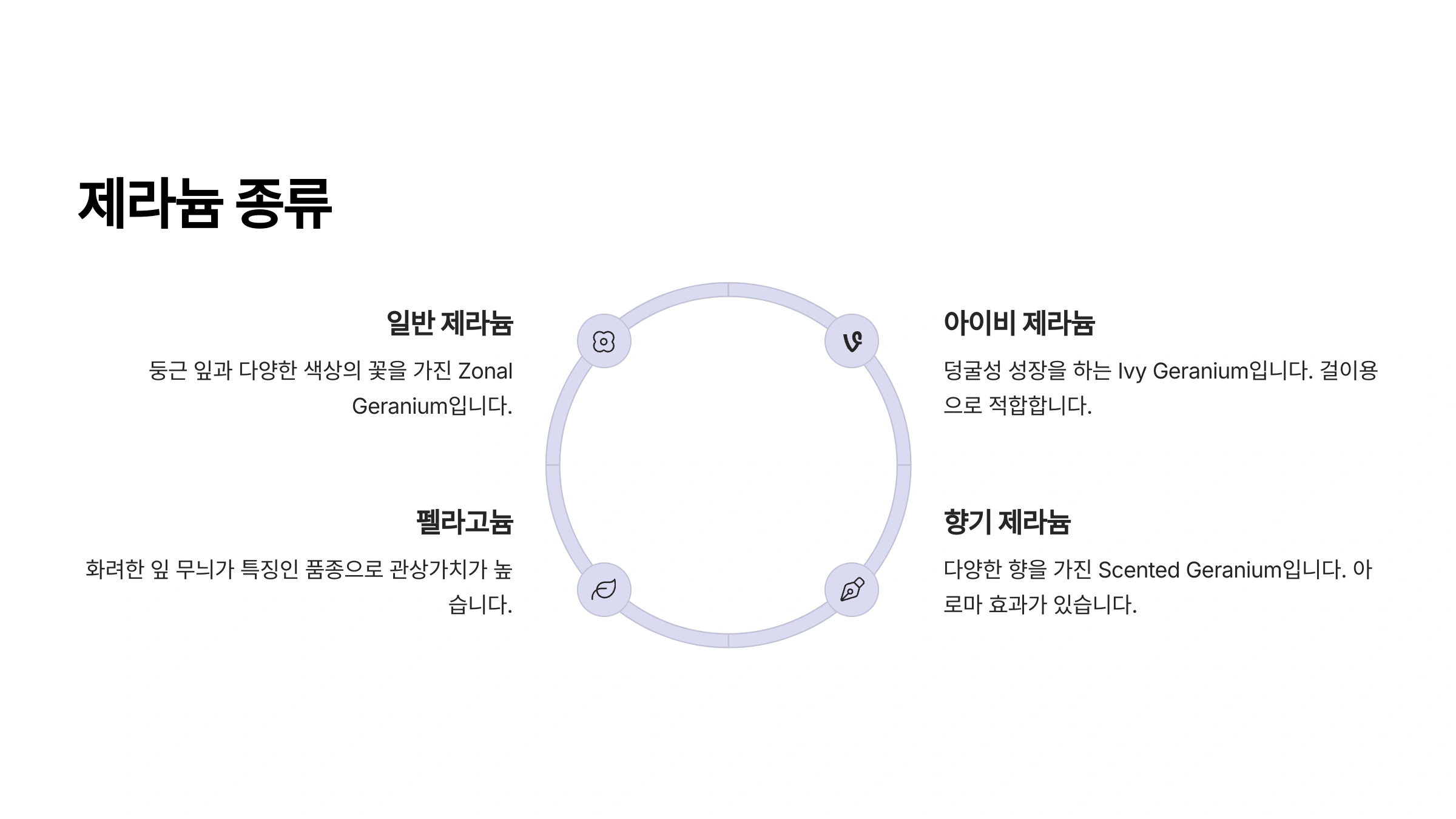 우리가 '제라늄'이라고 부르는 식물은 사실 '페라고늄(Pelargonium)' 속 식물이에요. 햇빛을 좋아하고 건조한 환경에 강해 비교적 키우기 쉬우면서도, 종류가 정말 다양해서 수집하는 재미가 쏠쏠하답니다. 대표적인 종류 몇 가지만 알아볼까요?