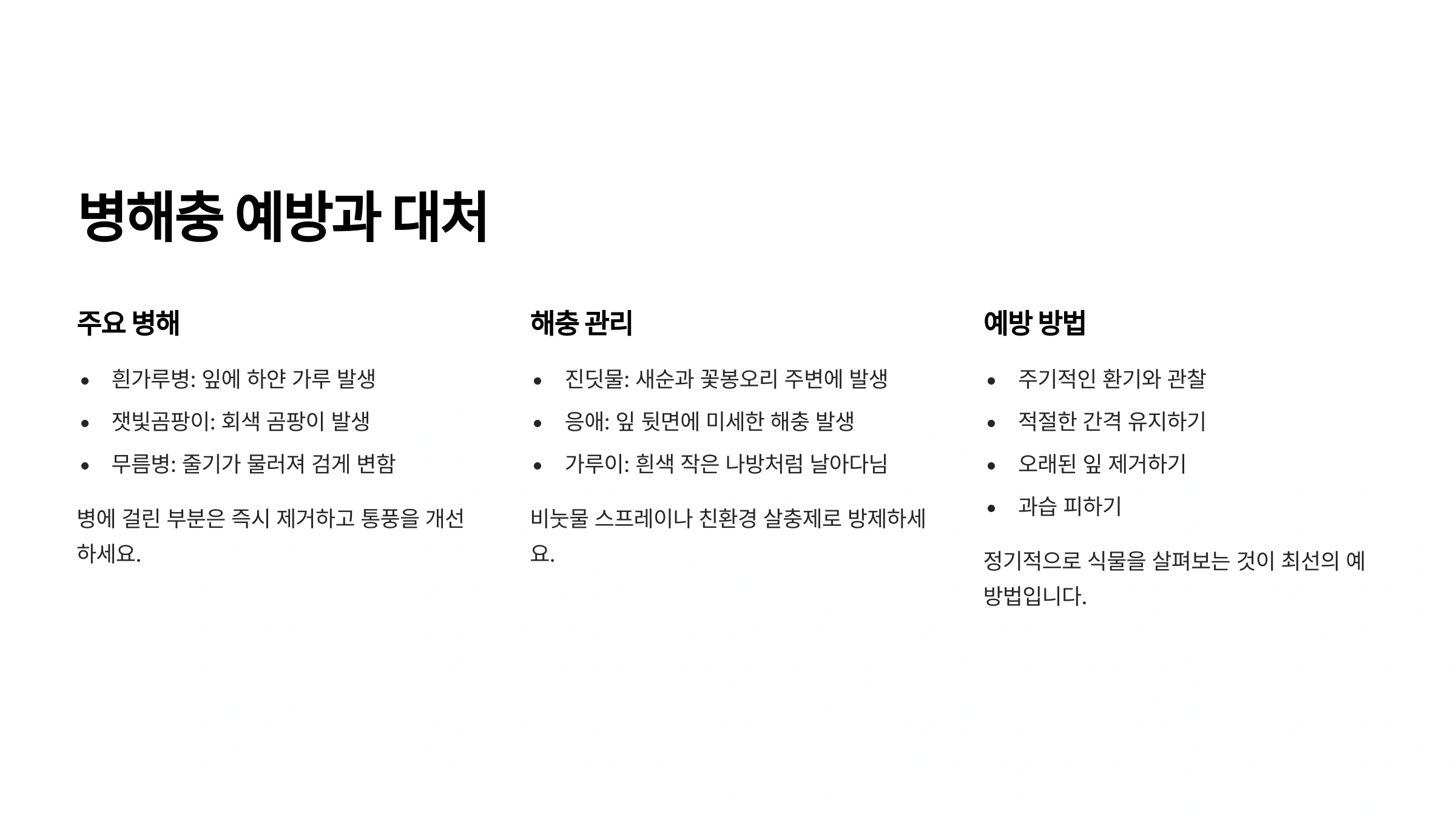 - 물은 2~3일에 한 번씩 갈아주어 깨끗하게 유지하는 것이 중요해요.