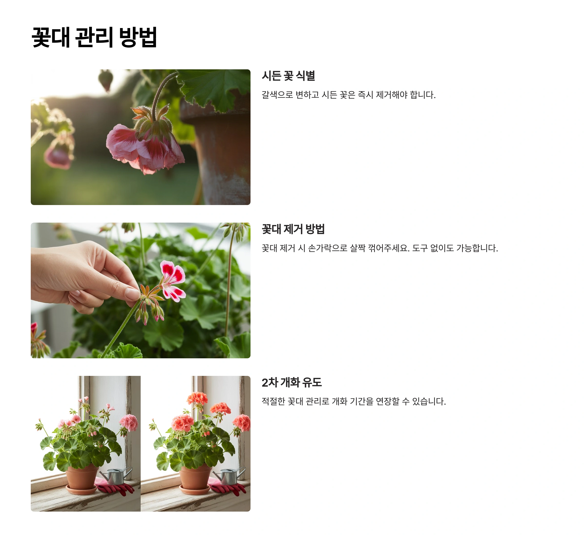 - 다듬기: 이후에는 새로 나오는 곁순들을 계속 순따기 해주며 동그랗고 풍성한 모양을 유지해 주면 나만의 멋진 제라늄 나무 완성!
