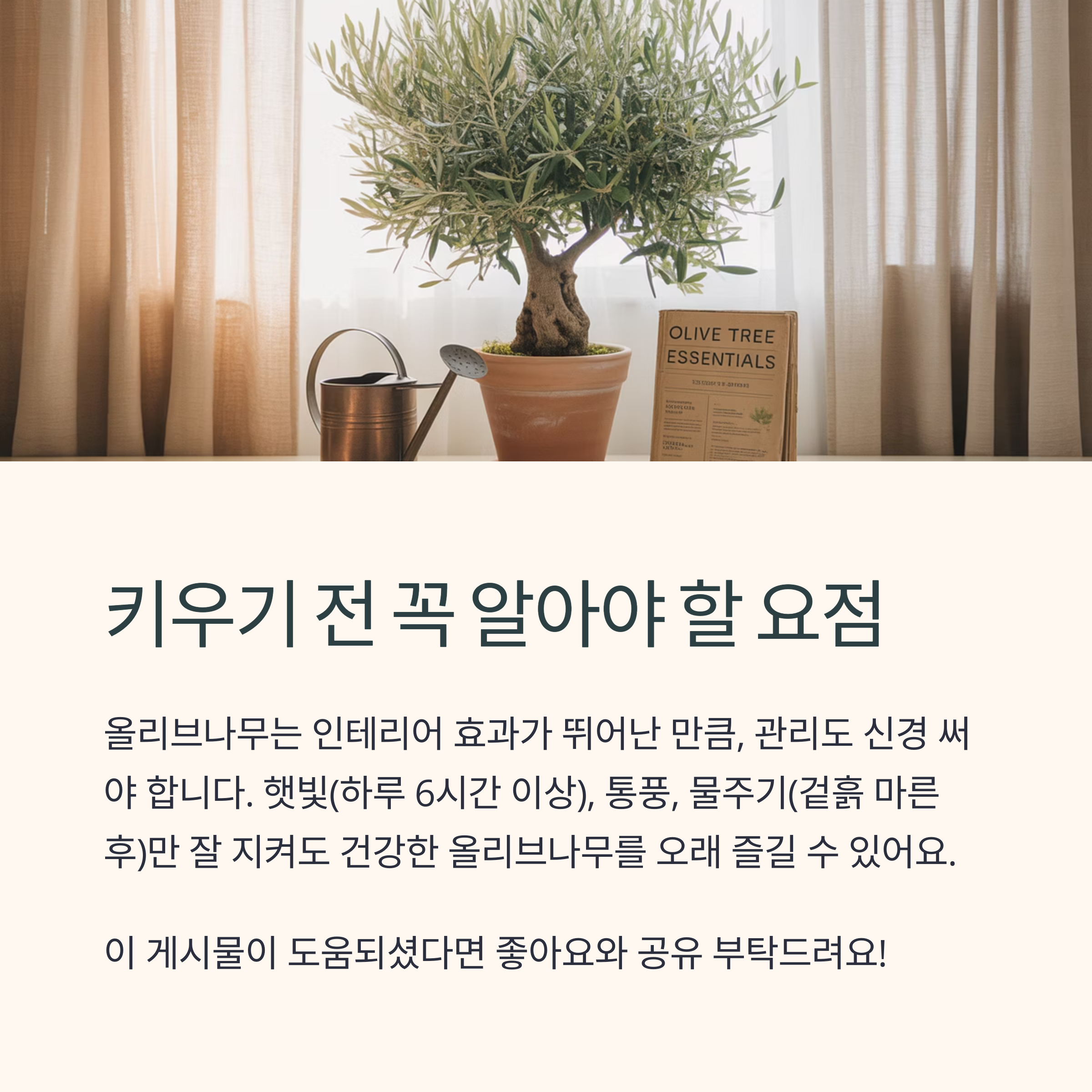 햇빛, 통풍, 물주기만 잘 조절해도 싱그러운 올리브나무를 오래도록 즐길 수 있습니다.