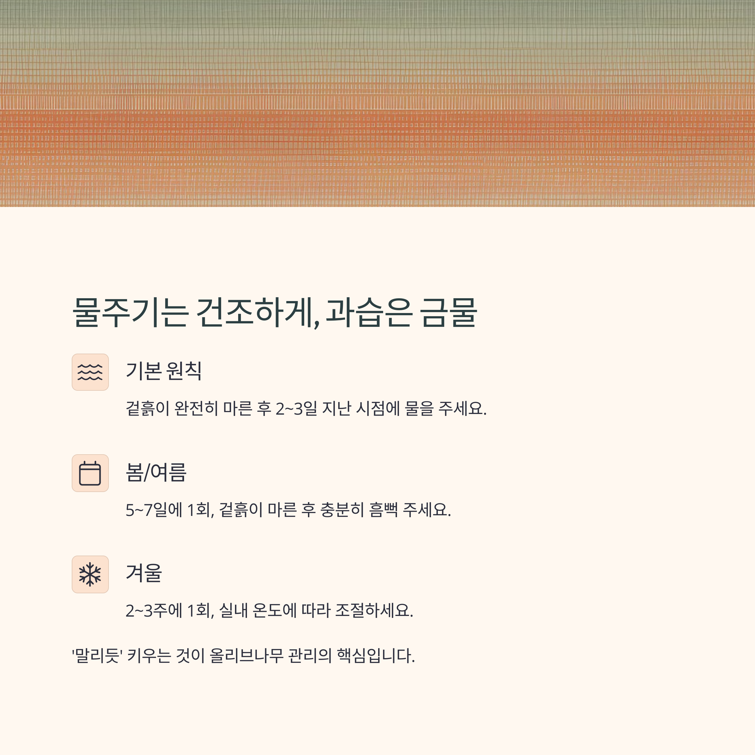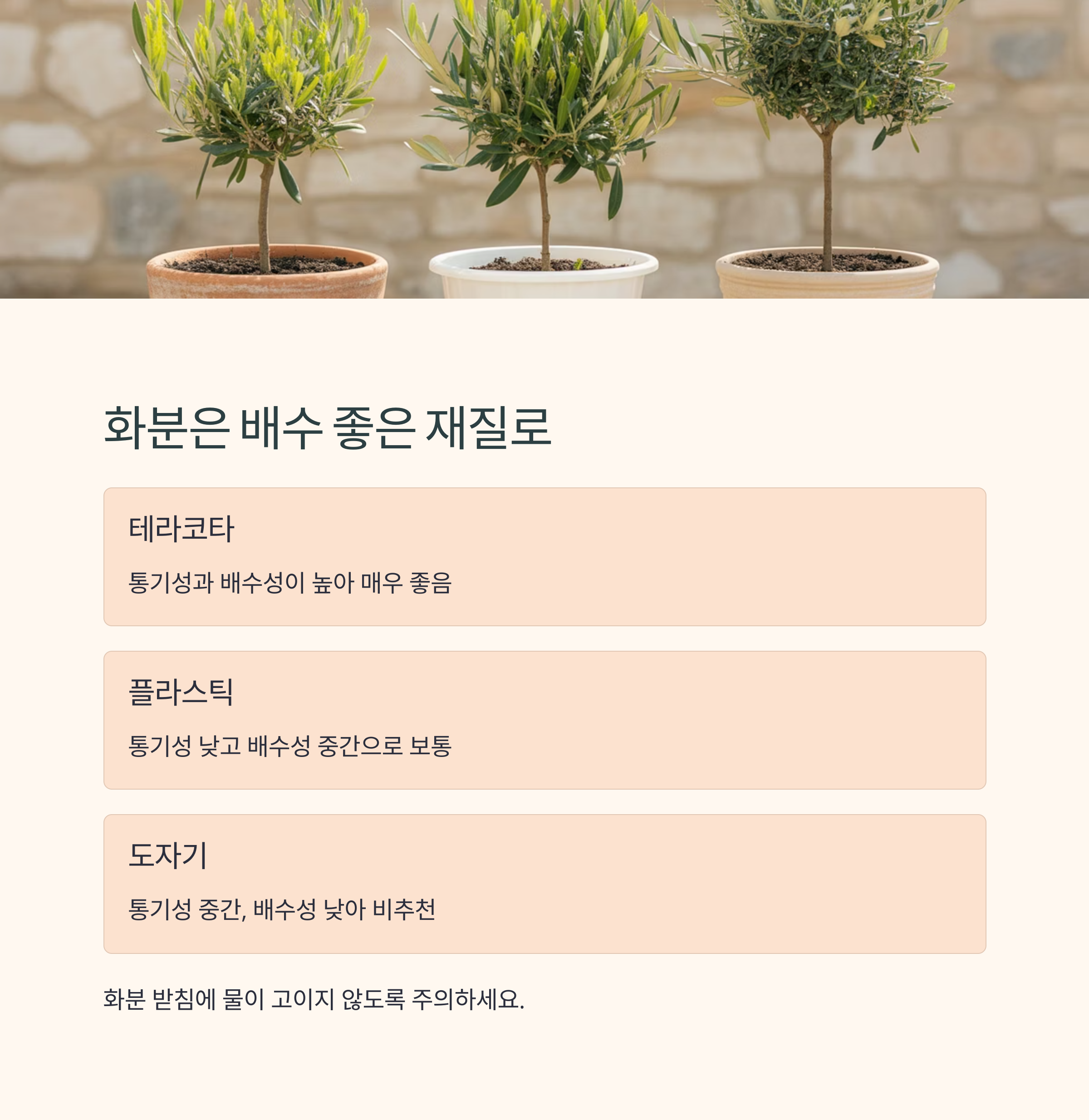 올리브나무는 보기보다 민감한 식물입니다. 습기에 약하고, 통풍이 나쁘면 뿌리 썩음이 생길 수 있습니다.