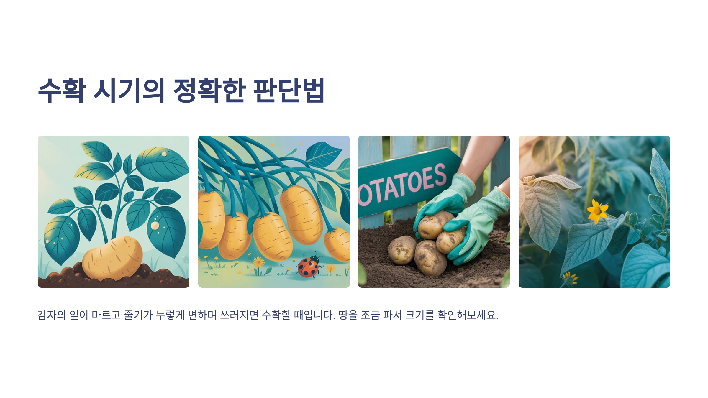 • 수확 시기: 감자 수확 시기는 품종과 심은 시기에 따라 다르지만, 보통 심은 후 90일에서 110일 정도 지나면 수확할 수 있습니다. 가장 확실한 수확 시기 판단 기준은 감자 잎과 줄기가 누렇게 변하면서 마르기 시작할 때예요. 장마가 오기 전에 수확하는 것이 좋으며, 그래서 '하지 감자'라는 말도 있죠! (하지는 보통 6월 21일경)