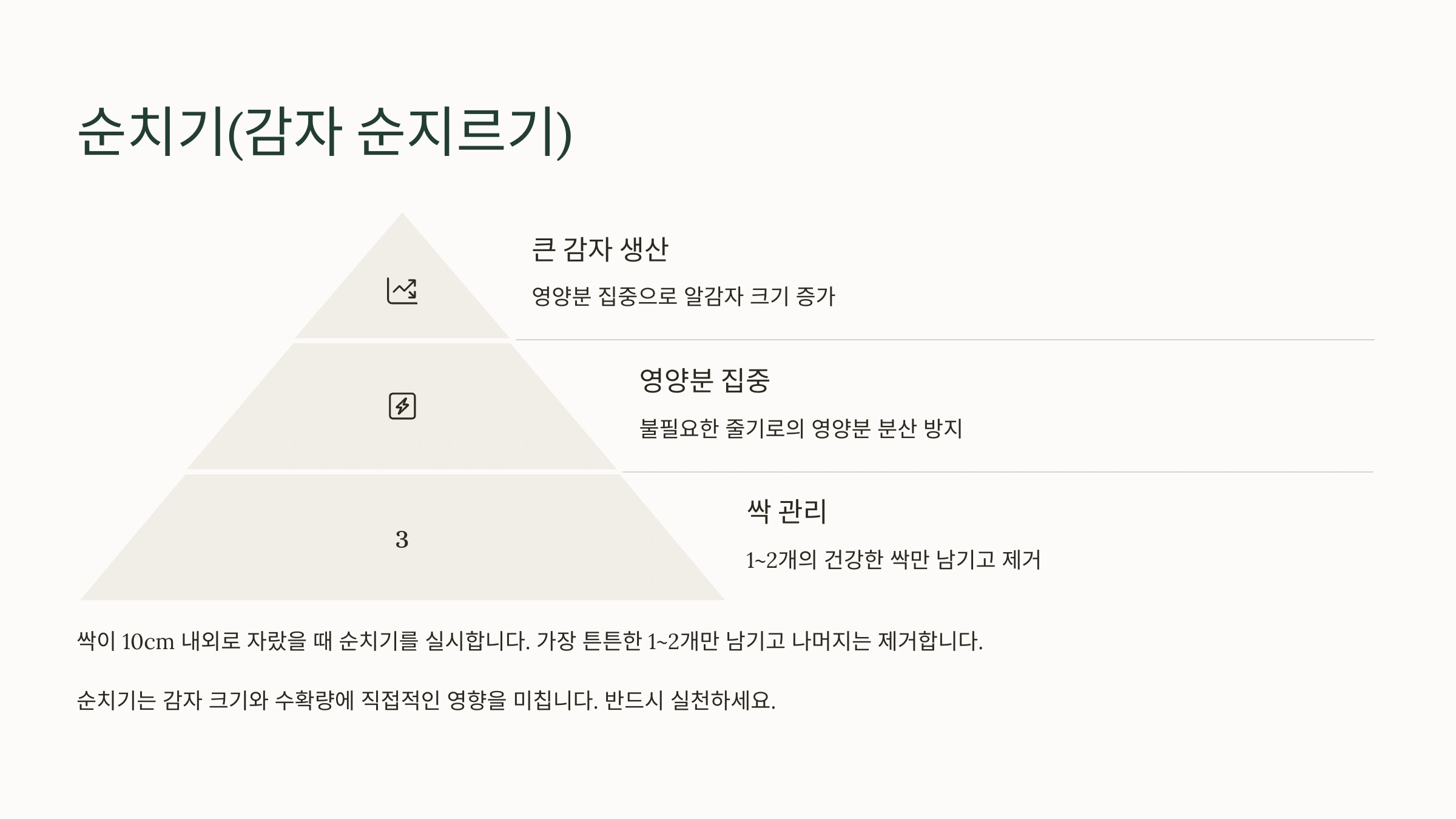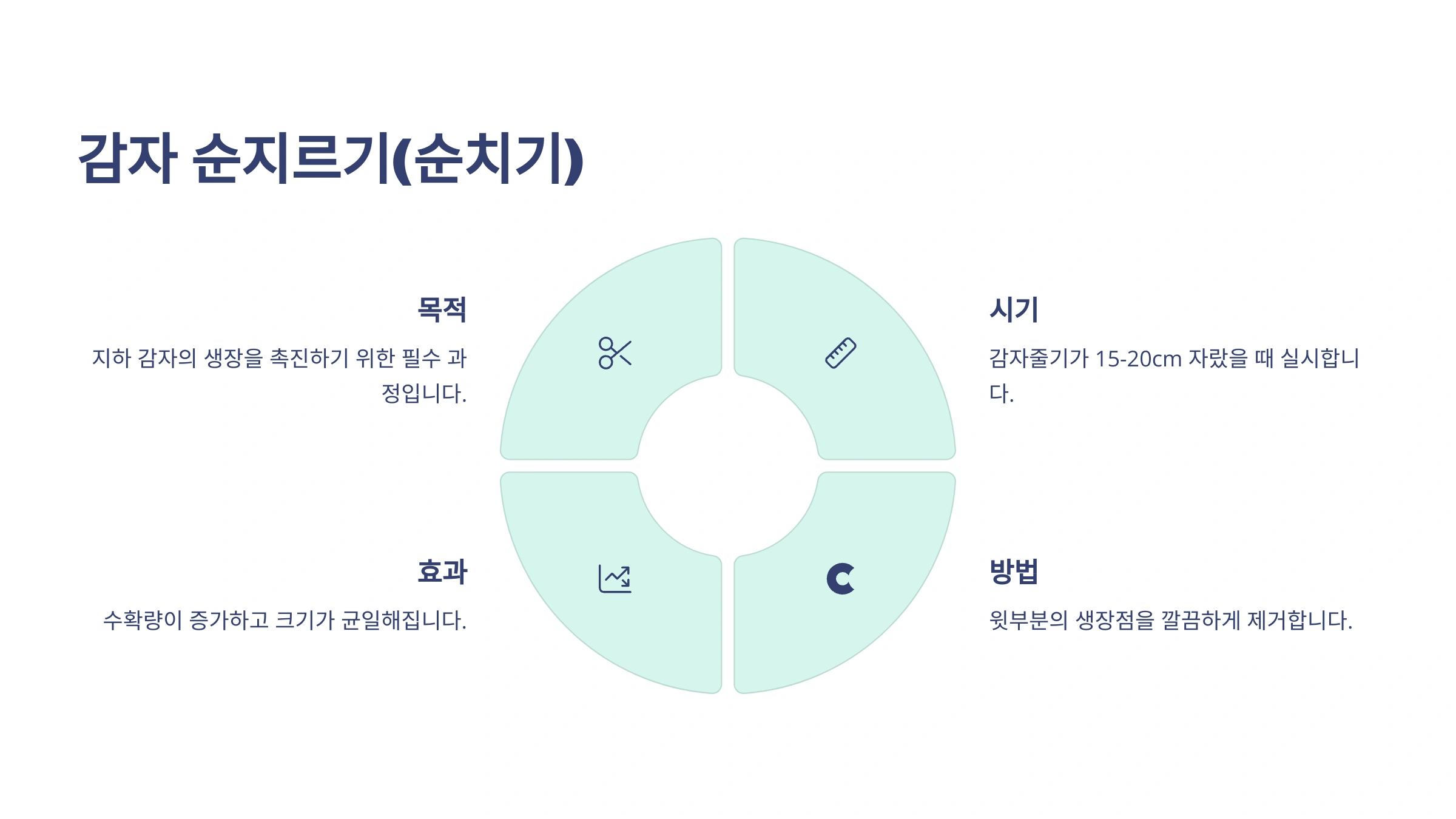 다만, 감자잎은 광합성을 통해 감자알을 키우는 중요한 역할을 하기 때문에 너무 많은 잎이나 줄기를 제거하면 오히려 생육에 좋지 않은 영향을 줄 수 있으니 주의해야 합니다. 초보자라면 굳이 순치기를 하지 않아도 괜찮습니다!