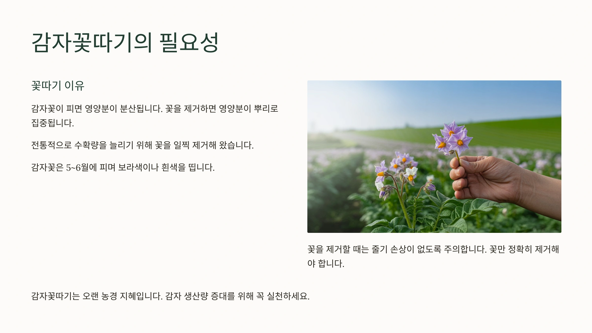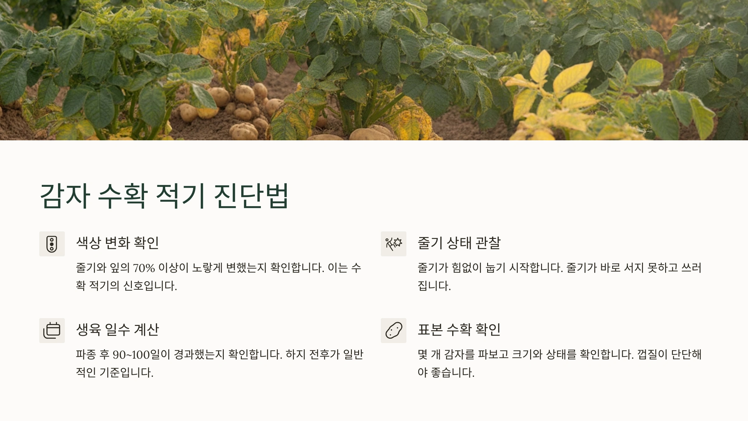 - 수확하기 1~2주 전에 감자 줄기를 미리 베어내면 감자 껍질이 단단해져서 저장성이 좋아지고 수확 작업도 편리해집니다.