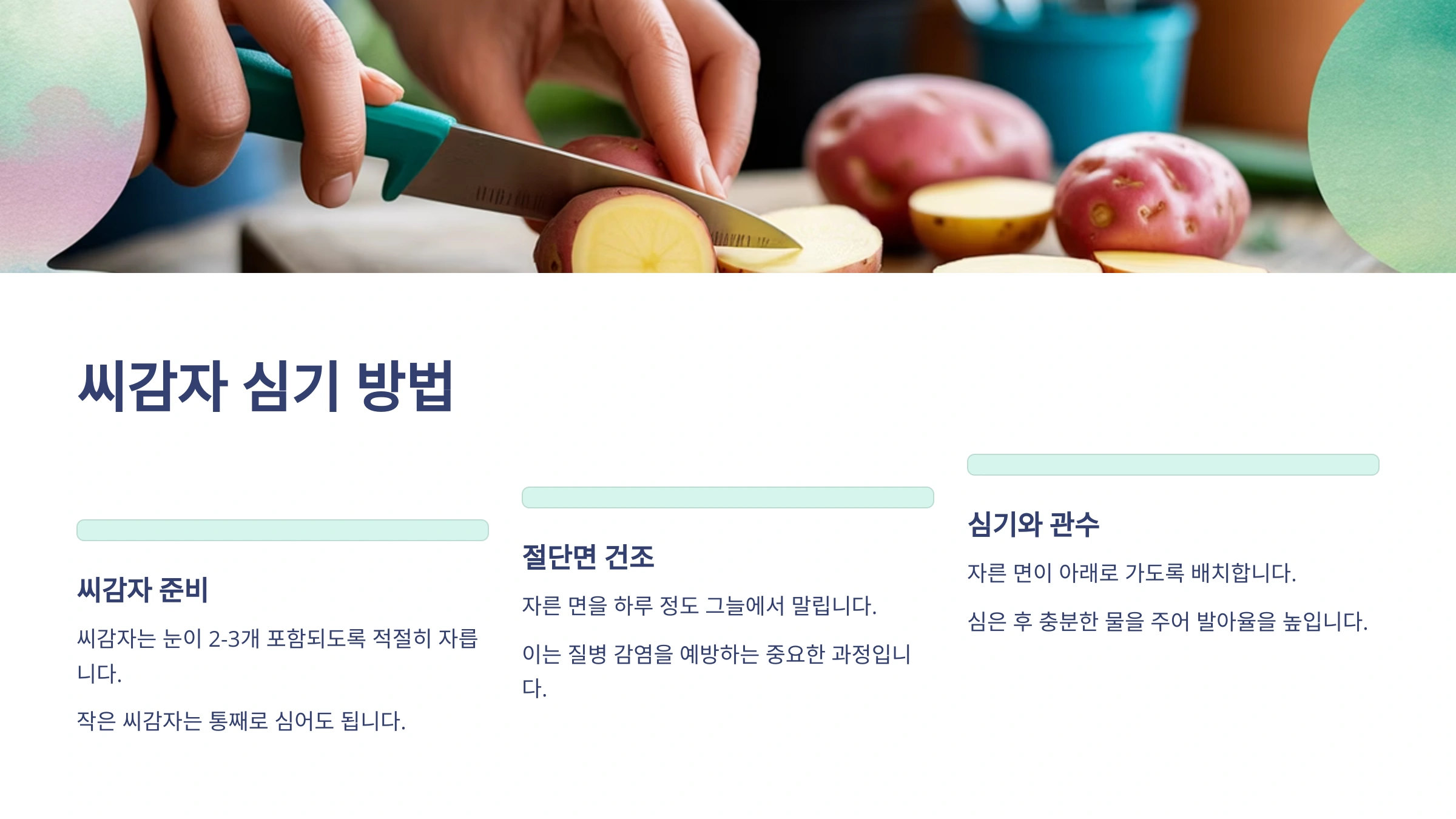 - 씨감자 자르기: 씨감자가 크면 2~4조각으로 자르되, 각 조각에 최소 1~2개 이상의 튼튼한 싹눈이 포함되도록 해주세요. 자른 단면은 재나 소독용 가루를 묻혀 2~3일 정도 말려주면 부패를 막는데 도움이 됩니다. (절단면 치유)