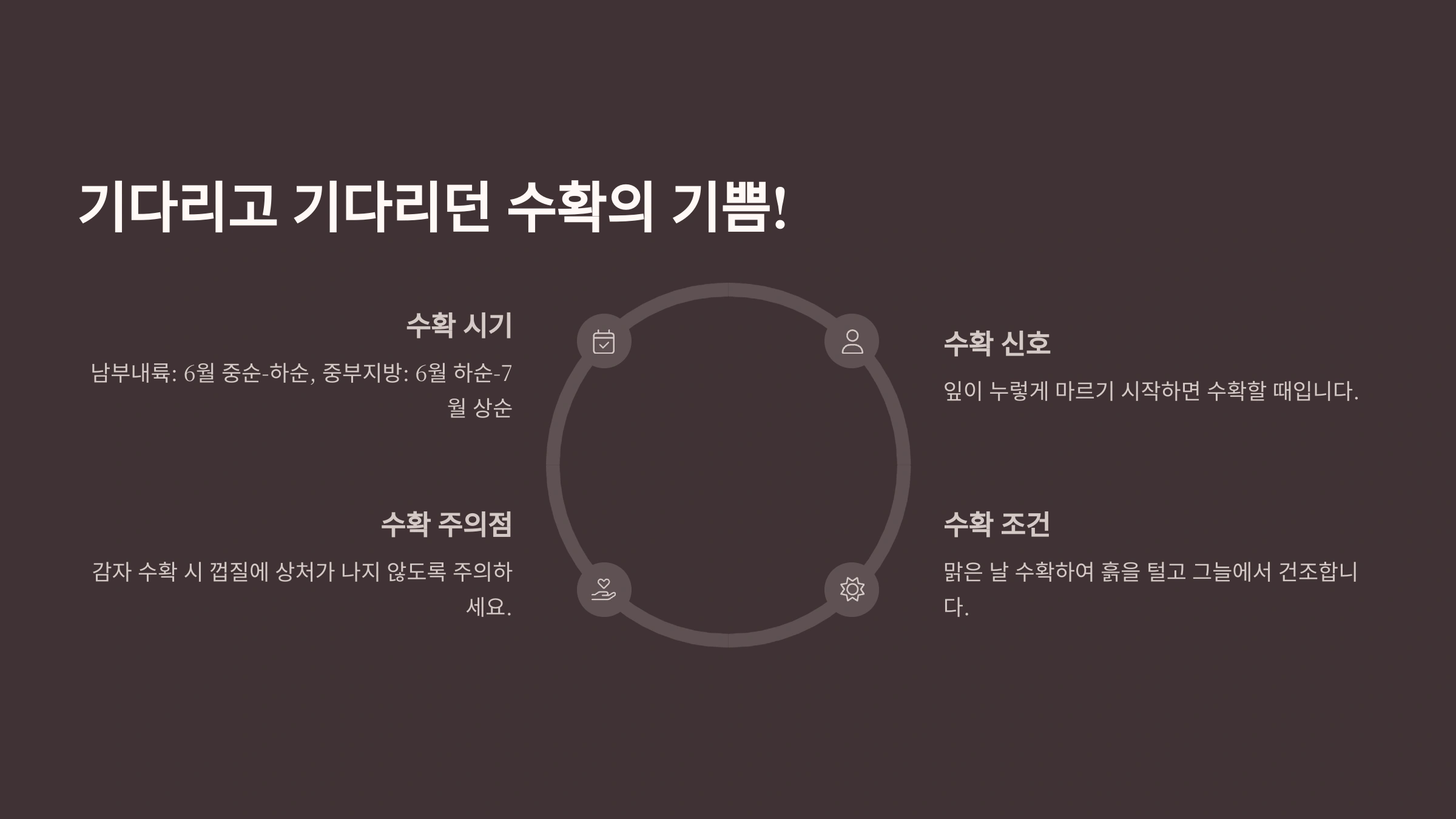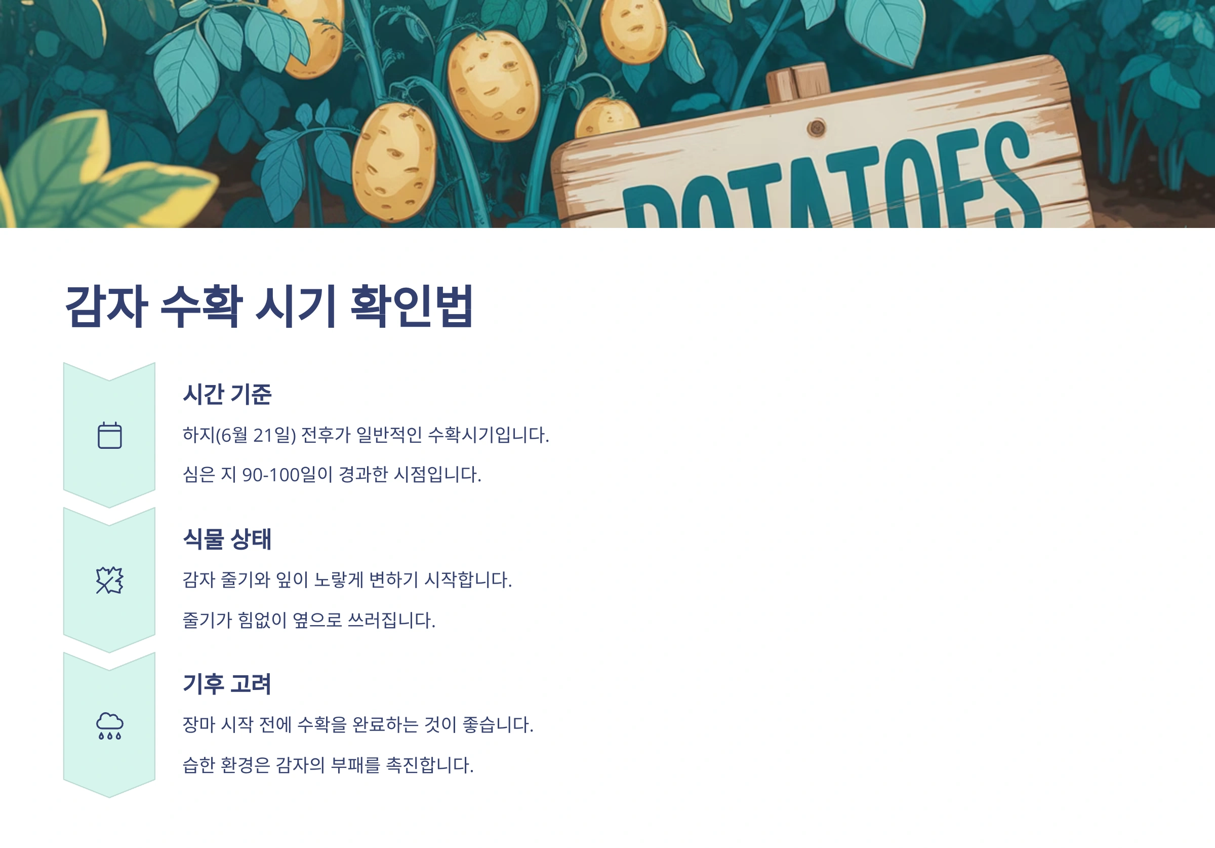 - 수확 시기: 감자 수확 시기는 품종과 심은 시기에 따라 다르지만, 보통 심은 후 90일에서 110일 정도 지나면 수확할 수 있습니다. 가장 확실한 수확 시기 판단 기준은 감자 잎과 줄기가 누렇게 변하면서 마르기 시작할 때예요. 장마가 오기 전에 수확하는 것이 좋으며, 그래서 '하지 감자'라는 말도 있죠! (하지는 보통 6월 21일경)