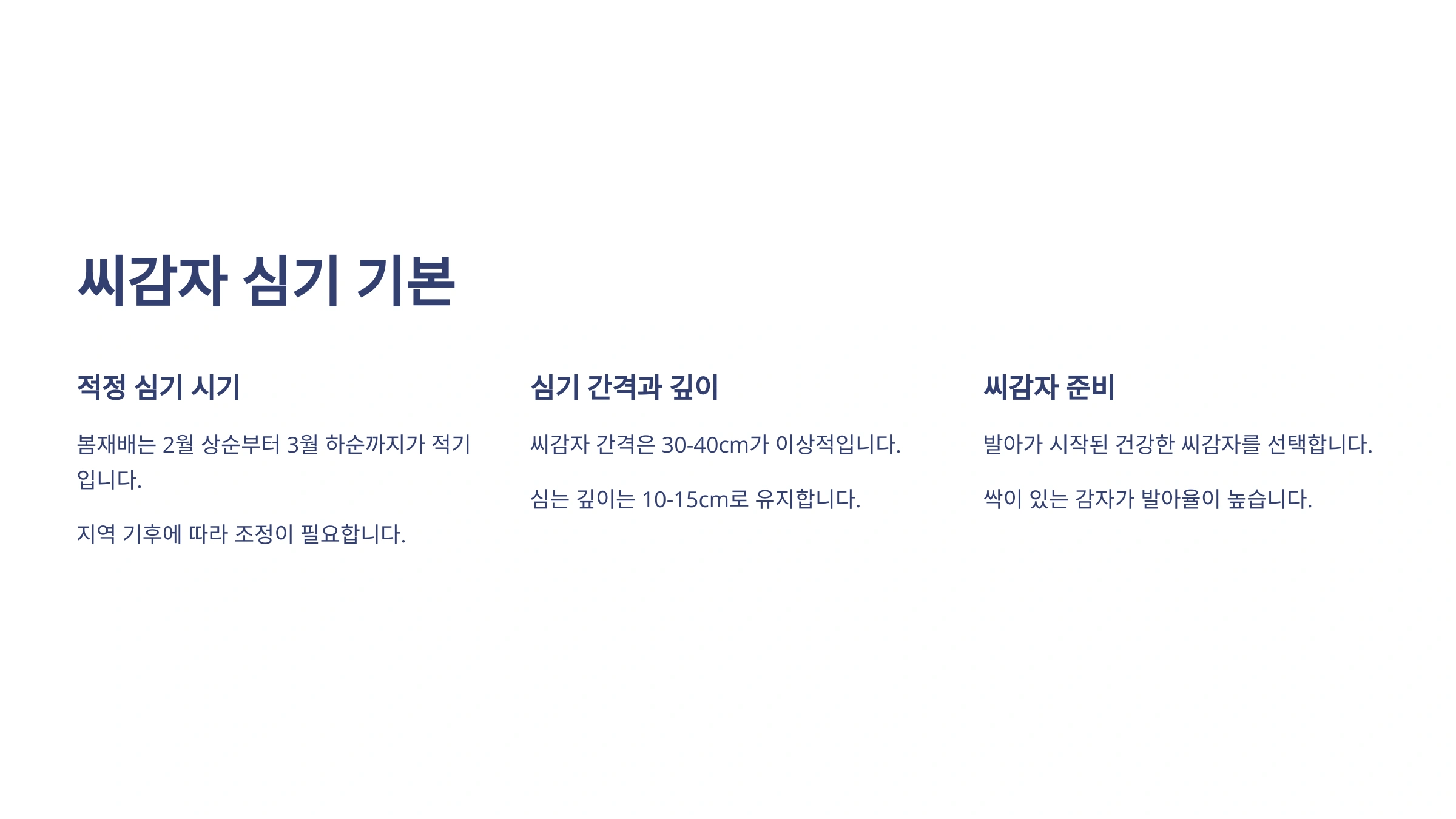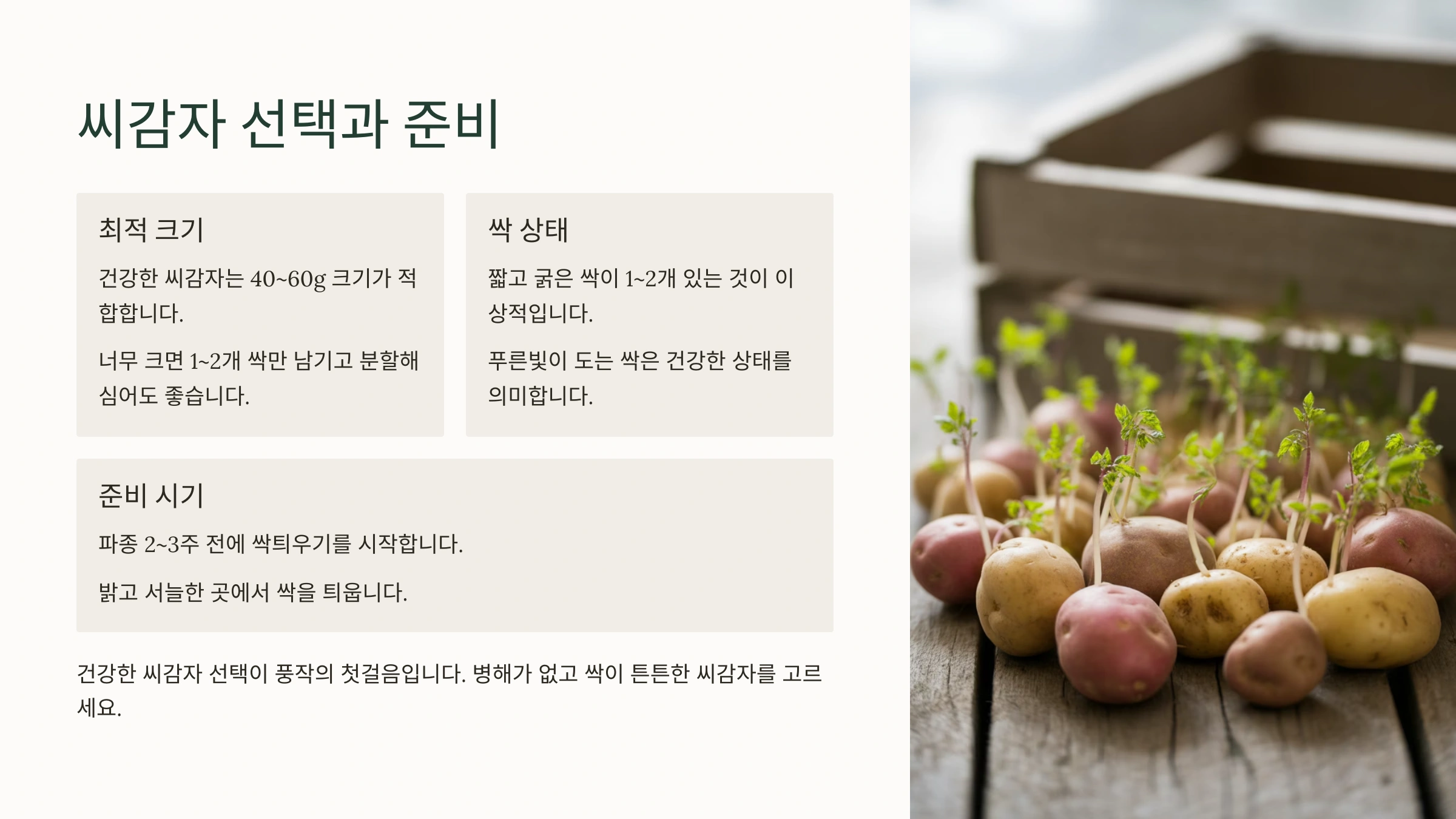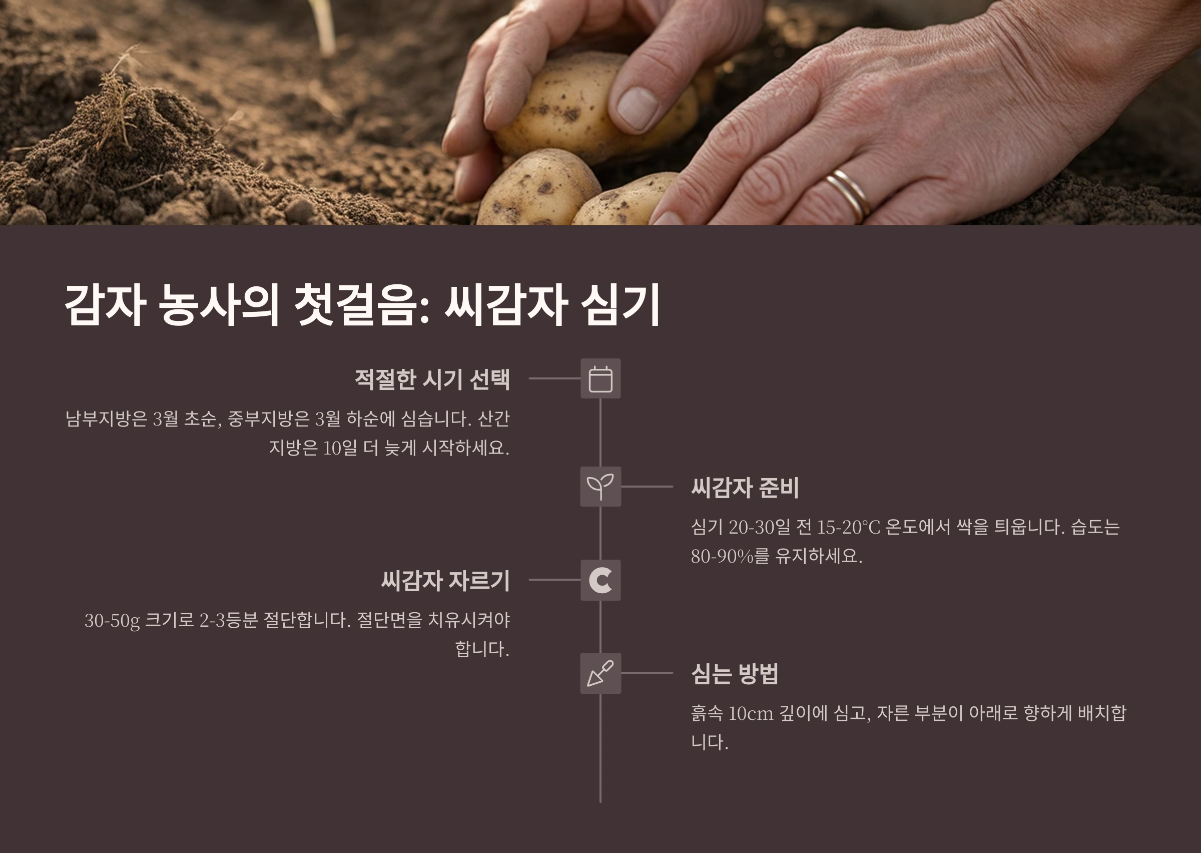 모든 농사의 시작은 씨앗(또는 모종) 심기죠! 감자 농사의 성공은 좋은 씨감자를 선택하고 알맞은 시기에 제대로 심는 것에서부터 시작됩니다.