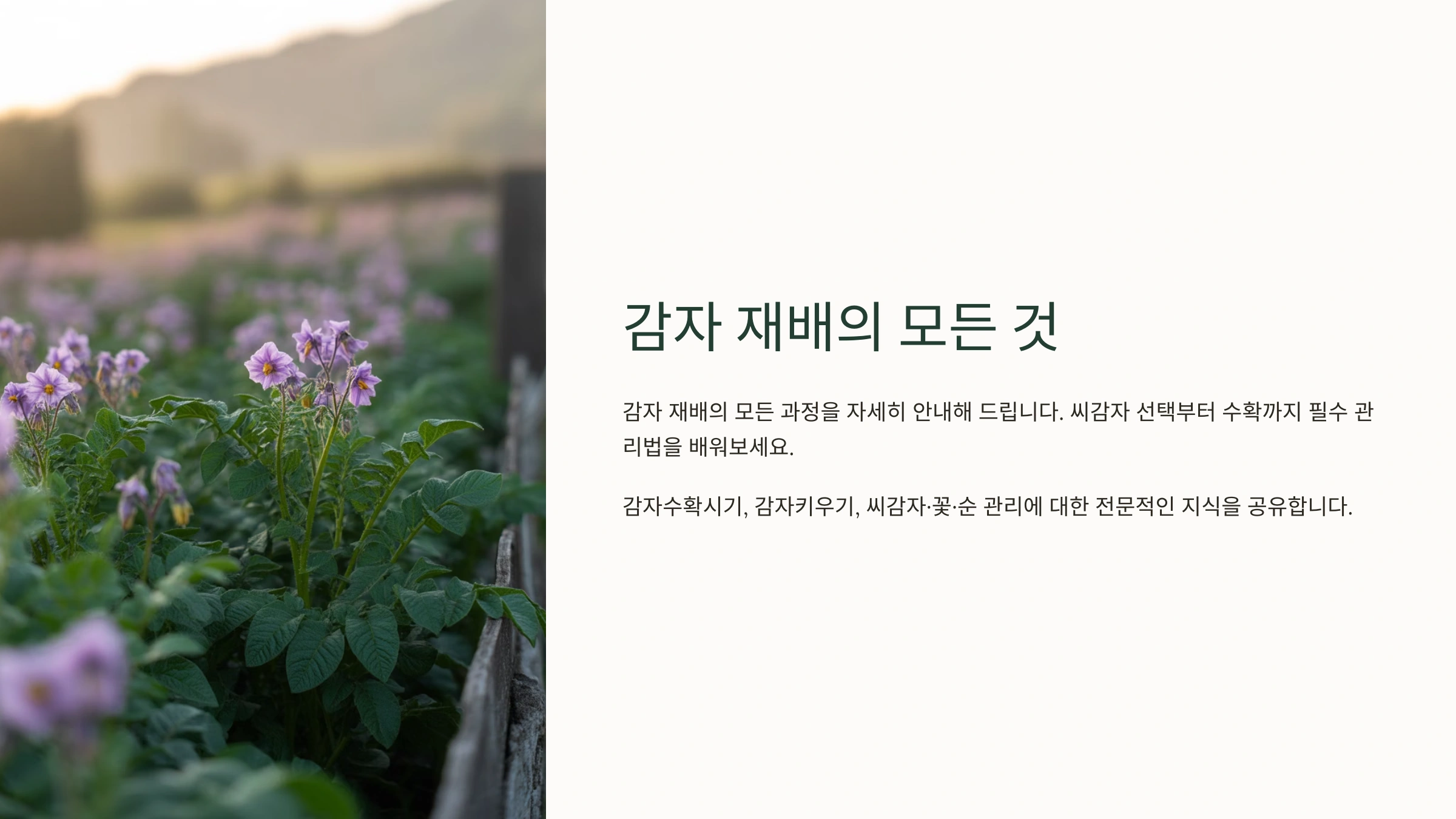 텃밭 가꾸기의 즐거움 중 하나는 직접 심은 작물이 쑥쑥 자라나는 모습을 보는 것이죠! 그중에서도 감자는 비교적 키우기 쉽고 수확의 기쁨도 커서 많은 분들이 도전하는 작물인데요. 😊 하지만 막상 시작하려고 하면 씨감자는 어떻게 심어야 하는지, 웃거름은 언제 줘야 하는지, 감자꽃은 따야 하는지 말아야 하는지, 잎이나 줄기는 정리해야 하는지 등 궁금한 점이 한두 가지가 아닐 거예요. 그래서 오늘은 감자 농사의 시작부터 끝까지, 풍성한 수확을 위한 모든 과정을 알기 쉽게 정리해 드리려고 합니다! 저만 믿고 따라오시면 올해 감자 농사는 문제없을 거예요! 😉