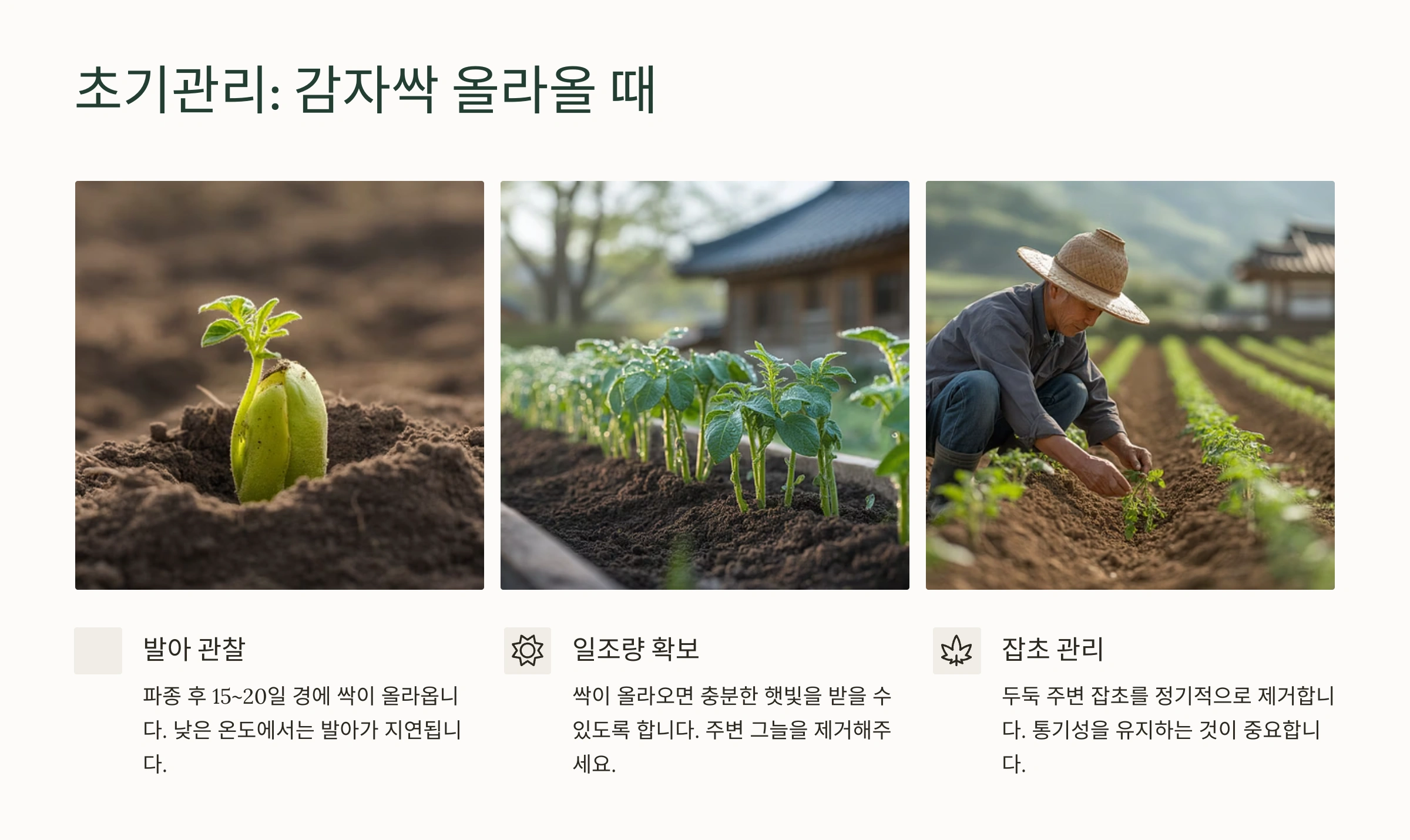 씨감자를 심었다고 끝이 아니죠! 건강하고 실한 감자를 수확하기 위해서는 꾸준한 관리가 필요합니다.