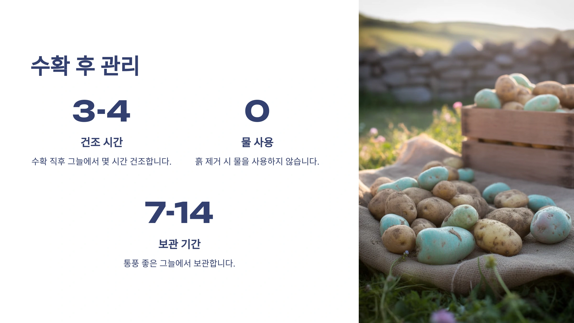 • 수확 후 관리 (큐어링): 수확한 감자는 바로 햇볕에 노출시키면 좋지 않아요. 그늘지고 통풍이 잘 되는 곳에서 며칠간 말려주면(큐어링) 상처가 아물고 저장성이 높아집니다.