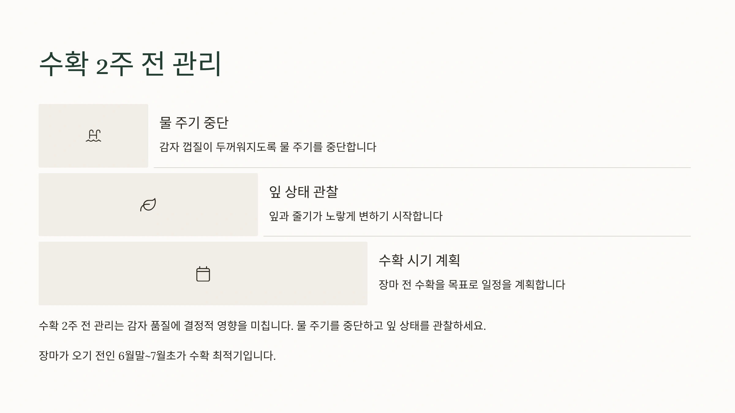 [수확 시기]: 잎/줄기가 마를 때 (심은 후 90~110일), 장마 전