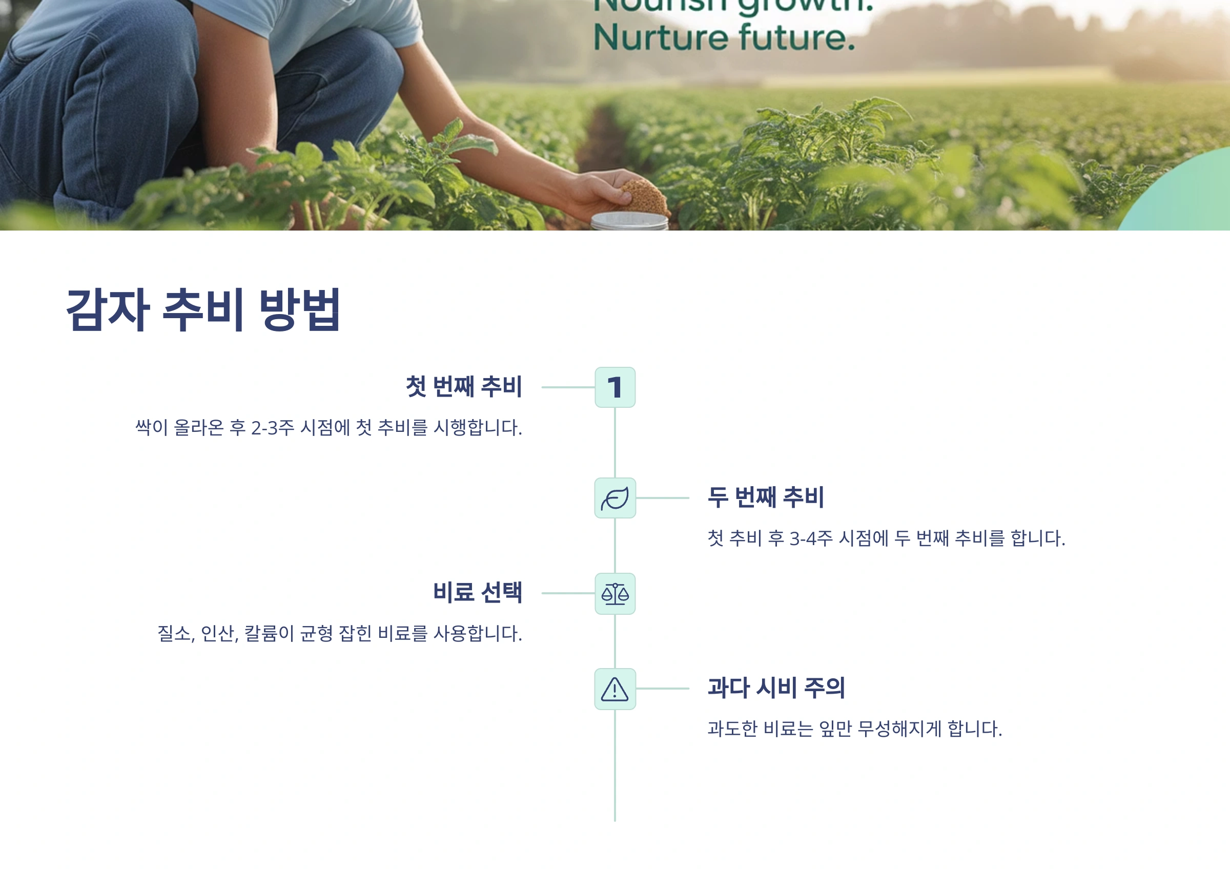 밑거름만으로는 감자가 자라는 데 필요한 모든 영양분을 공급하기 어려울 수 있어요. 그래서 중간에 추가로 비료를 주는 '추비(웃거름)' 작업이 필요합니다. 감자 추비는 보통 북주기 할 때 함께 주는 것이 일반적입니다.