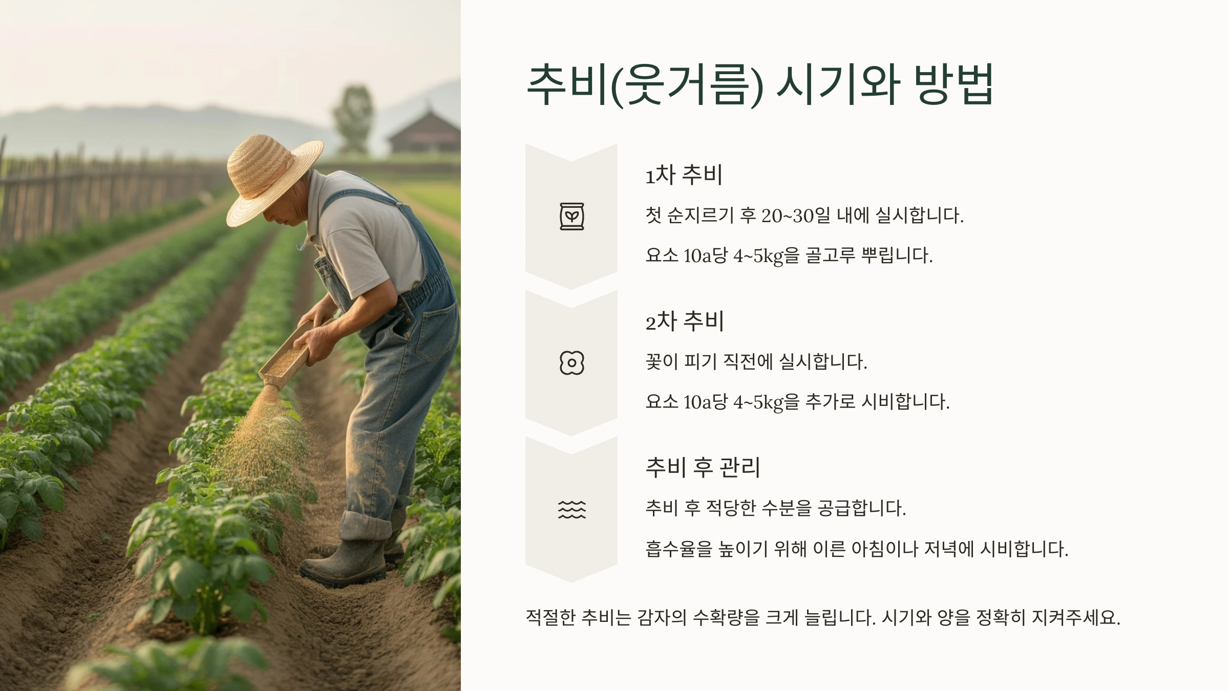 - 2차 추비: 꽃이 피기 시작할 무렵 (2차 북주기 시)