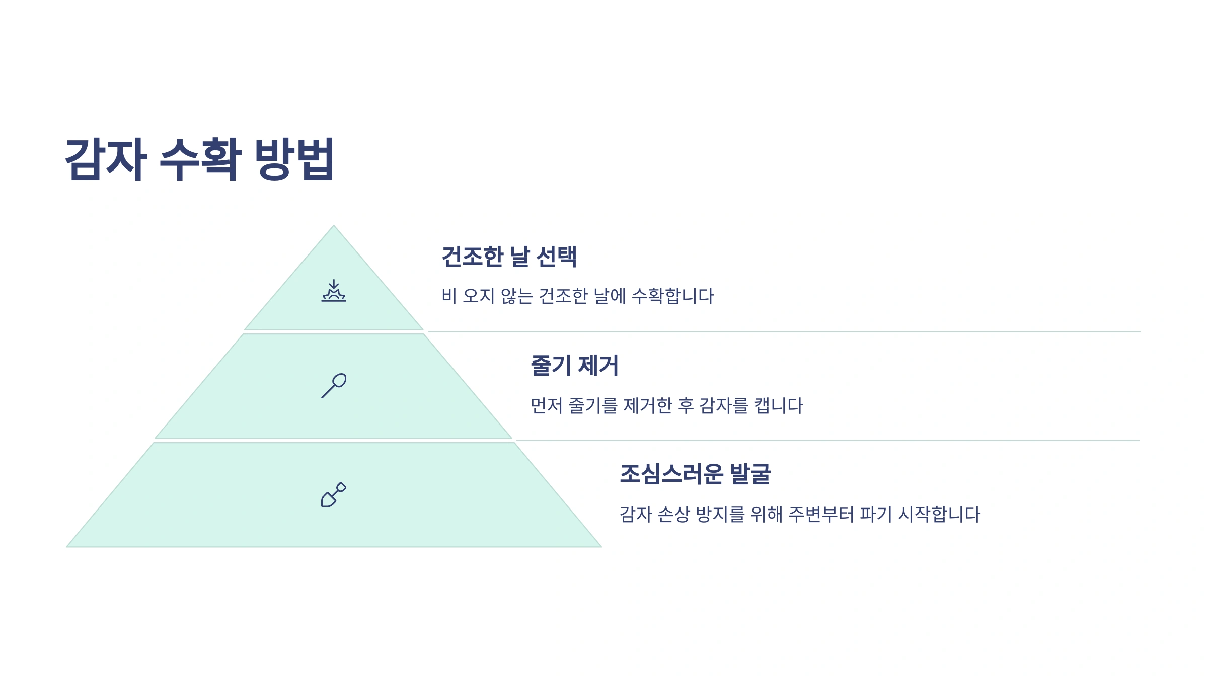 • 수확 후 관리 (큐어링): 수확한 감자는 바로 햇볕에 노출시키면 좋지 않아요. 그늘지고 통풍이 잘 되는 곳에서 며칠간 말려주면(큐어링) 상처가 아물고 저장성이 높아집니다.