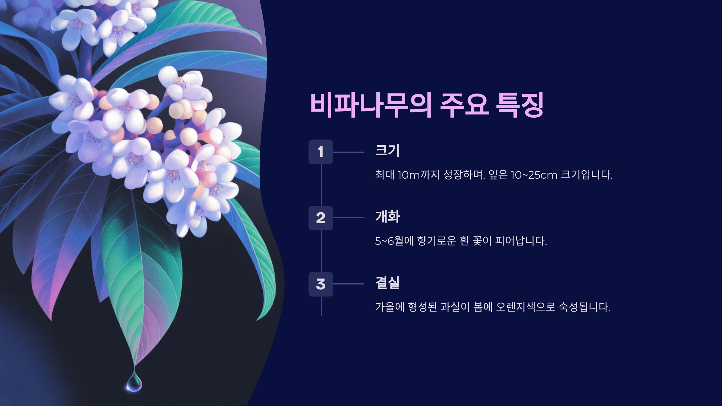 비파나무는 장미과에 속하는 상록 교목으로, 잎이 악기 '비파'를 닮았다고 해서 이런 이름이 붙었어요. 겨울에 아름다운 흰 꽃을 피우고, 초여름(5~6월)에 황금빛 열매를 맺는 아주 독특한 나무죠. 보통 다른 과일나무들은 봄에 꽃을 피우는데, 비파나무는 추운 겨울을 이겨내고 꽃을 피우니 그 생명력이 정말 대단하지 않나요?