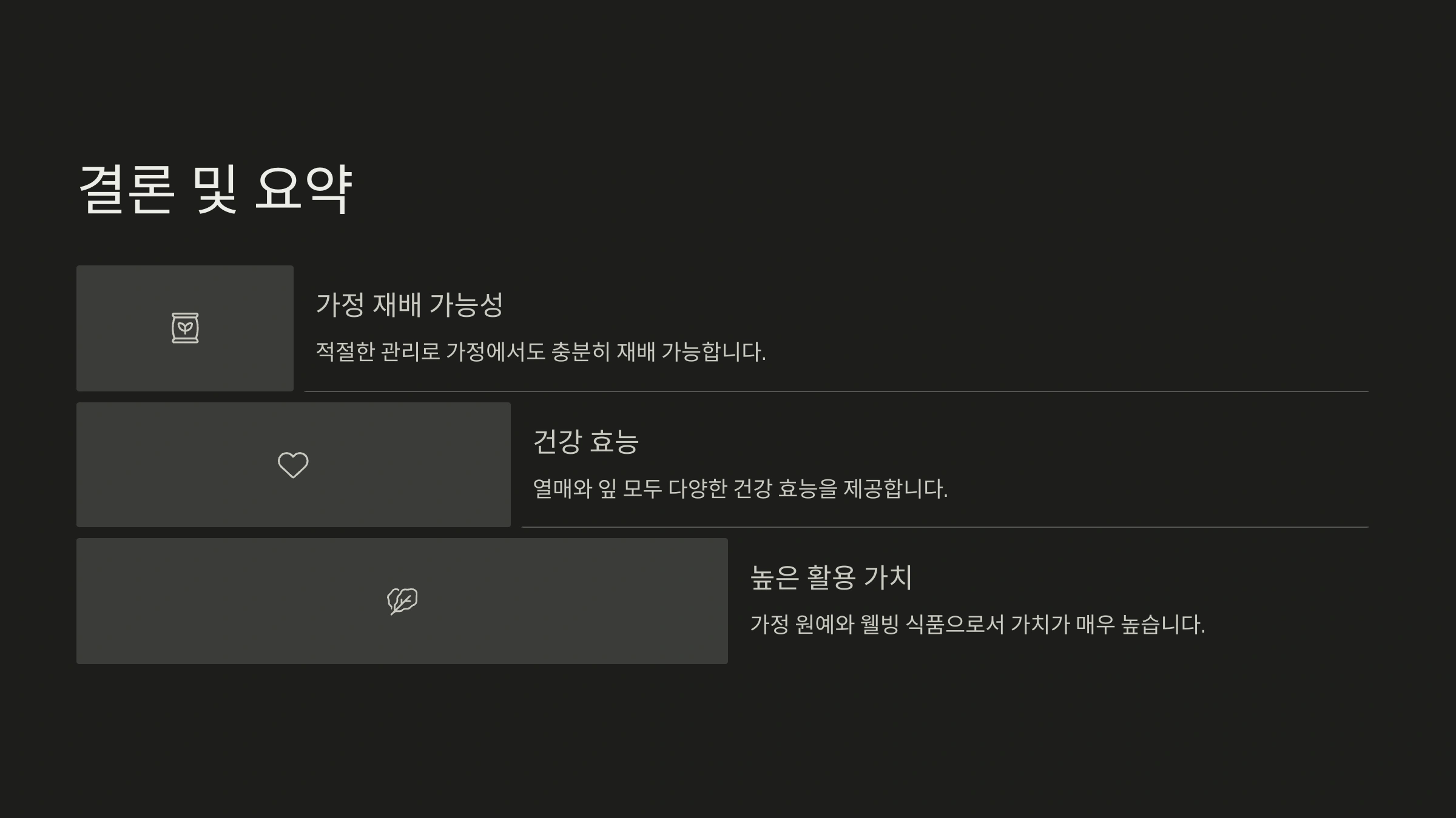 - 햇빛: 햇빛을 정말 좋아해요! 하루 종일 해가 잘 드는 양지바른 곳이 최적의 장소입니다. 햇빛을 충분히 받아야 열매도 달고 실하게 열린답니다.