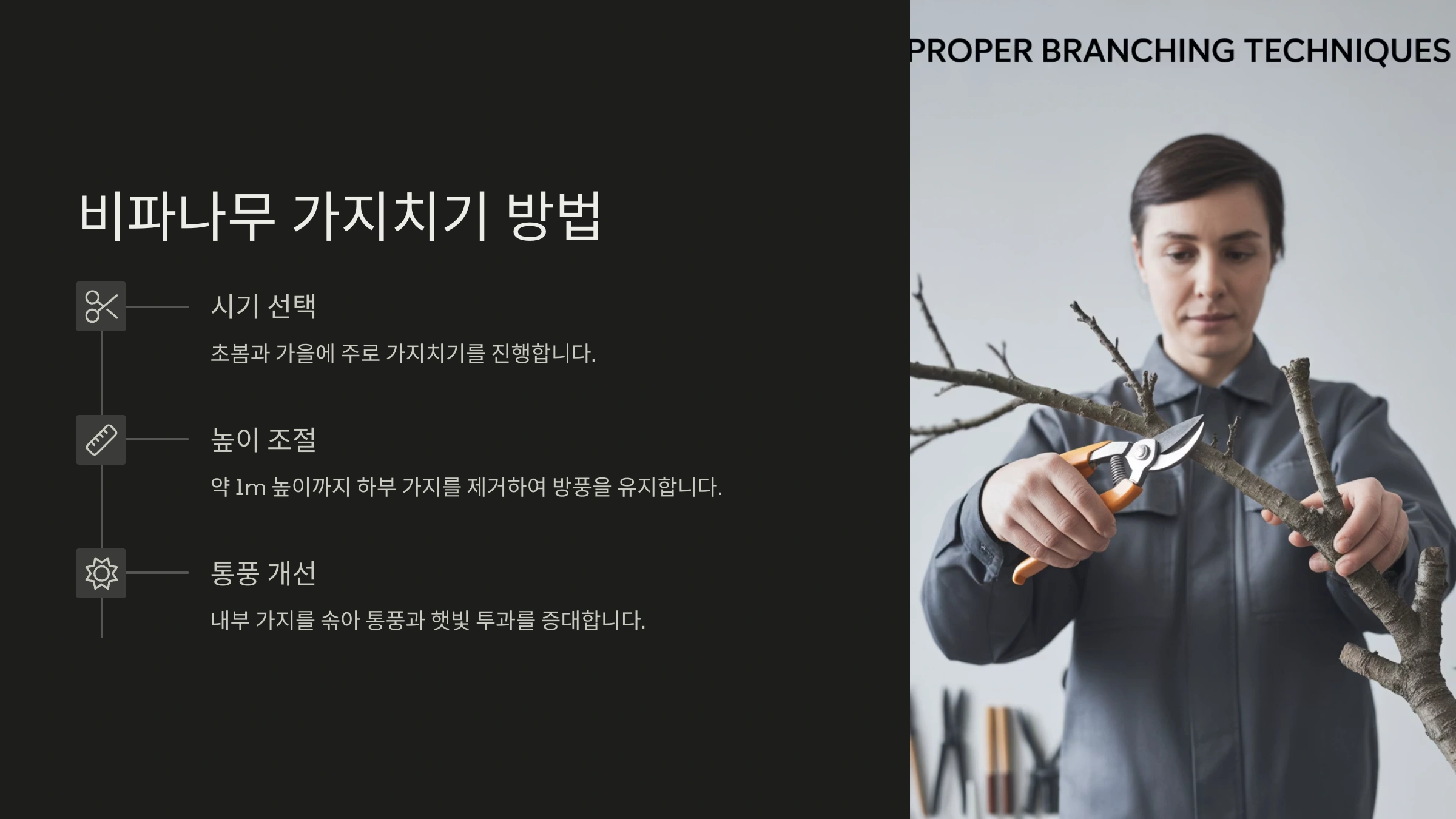 비파나무 가지치기(전정)는 열매를 모두 수확한 직후인 여름에 하는 것이 가장 좋아요. 너무 빽빽하게 자란 가지나 안쪽으로 향한 가지를 솎아내면 햇빛도 잘 들고 통풍도 원활해져서 다음 해에 더 튼실한 열매를 맺는답니다.