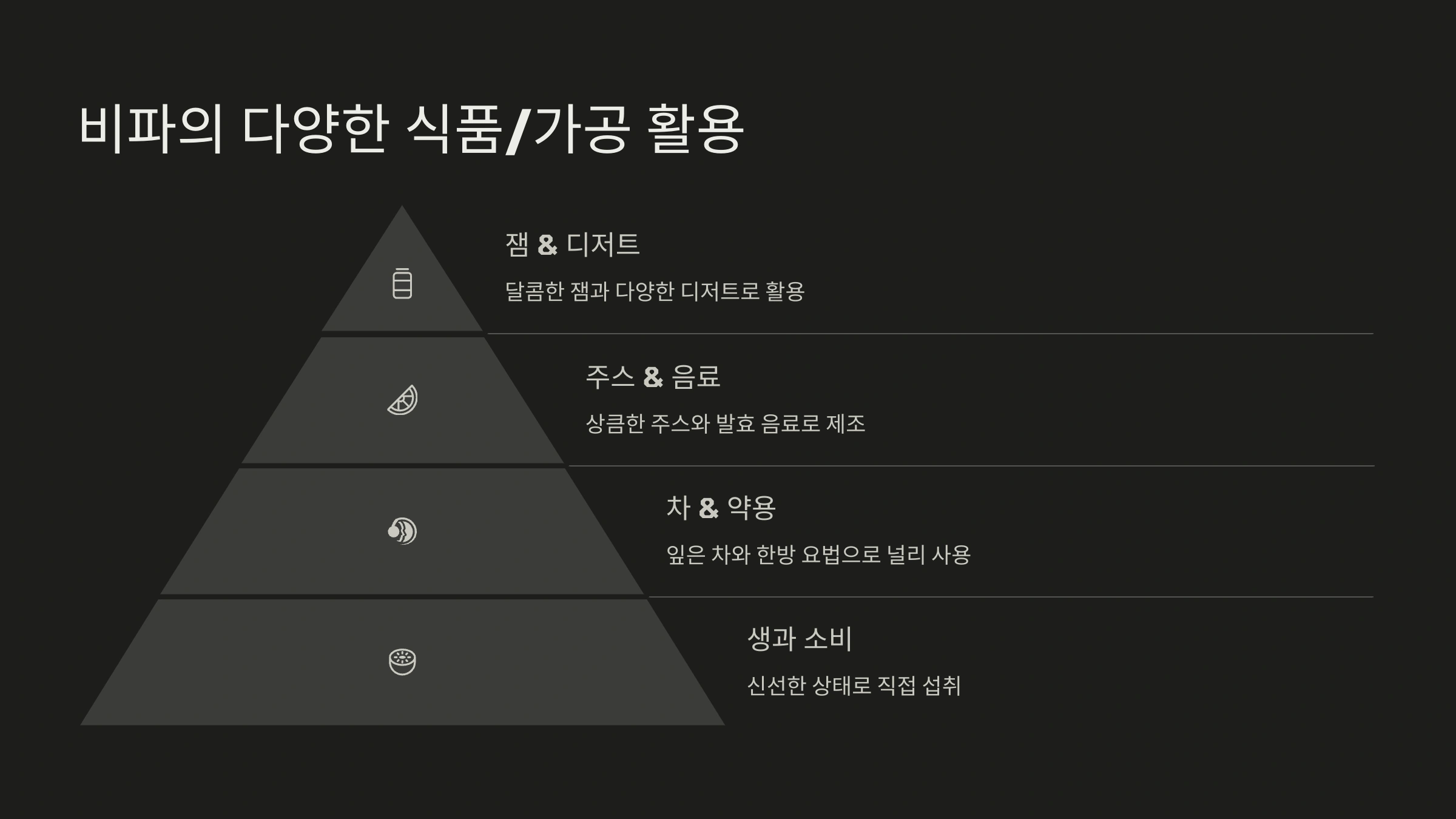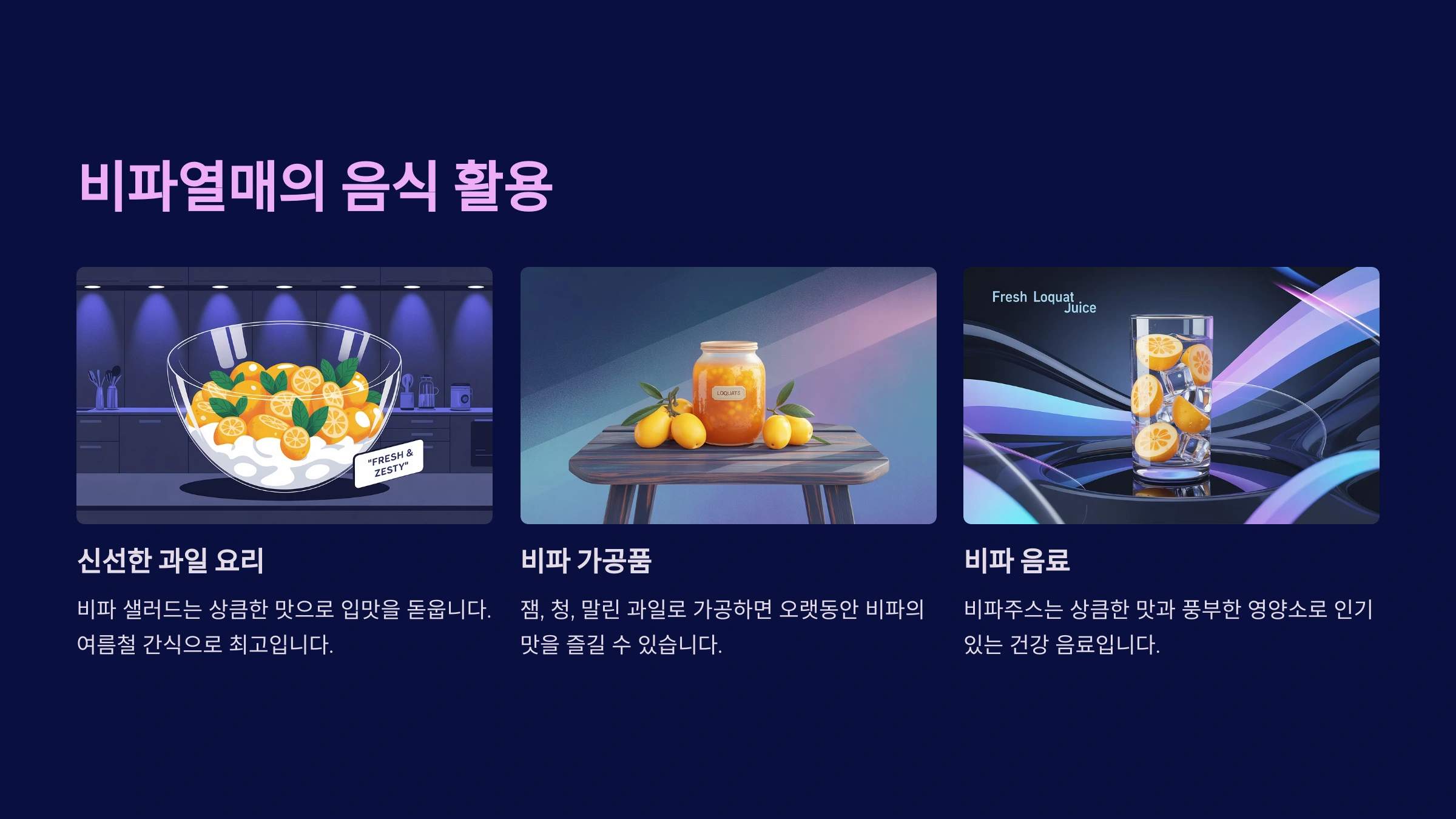 잘 익은 비파열매는 새콤달콤한 맛이 일품이라 그냥 먹는 것이 가장 맛있어요. 하지만 수확량이 많을 때는 잼이나 청, 담금주로 만들어 오랫동안 즐길 수 있습니다.